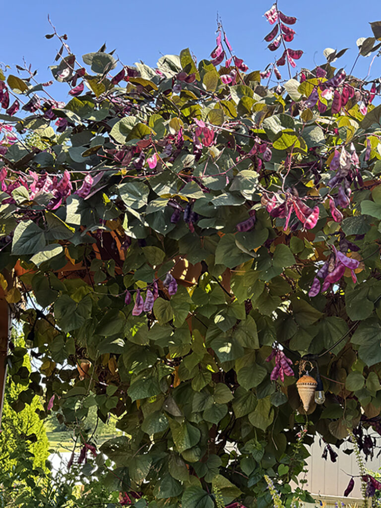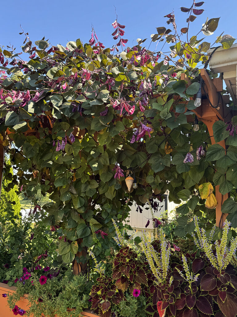 I spy with my little eye… somewhere deep in the lush greenery, I see one of my wheelthrown ornaments. While most people use them for Christmas trees… looks like Cheryl enjoys hers year-round when it’s hanging on her outdoor pergola. Even more amazing when it is being engulfed by some beautiful purple hyacinth bean vines!!! Thanks for showing off your garden Cheryl.