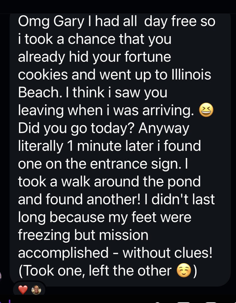 From Stacy – “Out walking today with my hubby and I told him about this. I found one right at the beginning of our hike! We love going to the beach trails at any time of year but it’s just so magical in the winter. Your adorable and beautiful fortune cookies was the cherry on top of our whole day! Thank you so much for taking the time to do this. Have a wonderful 2026!!”