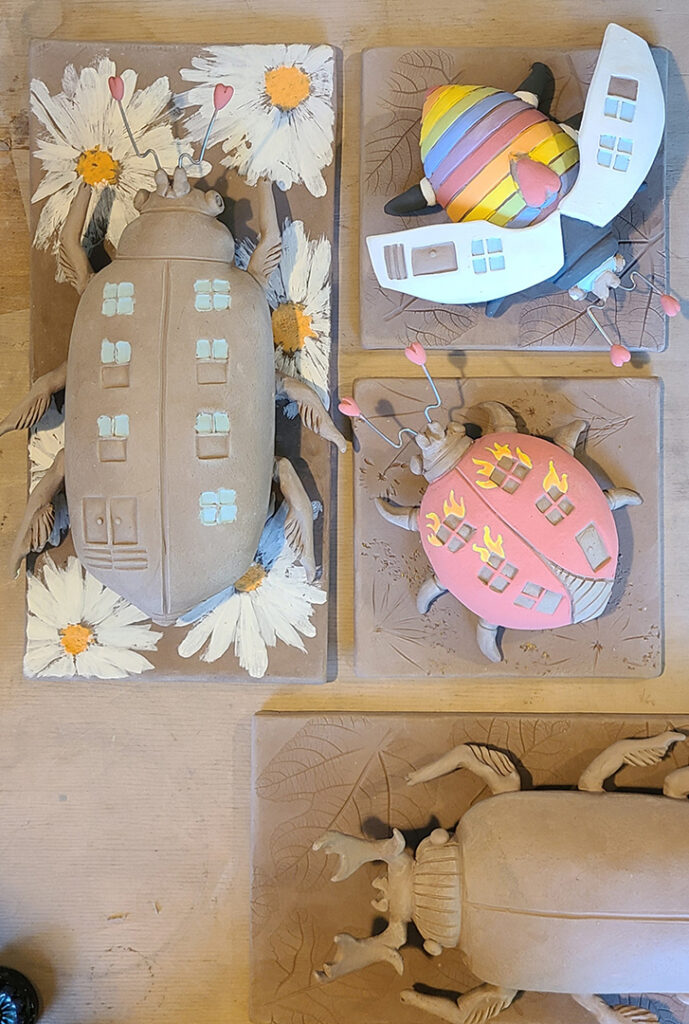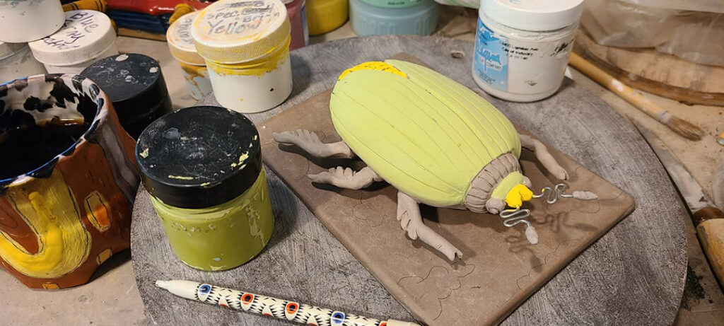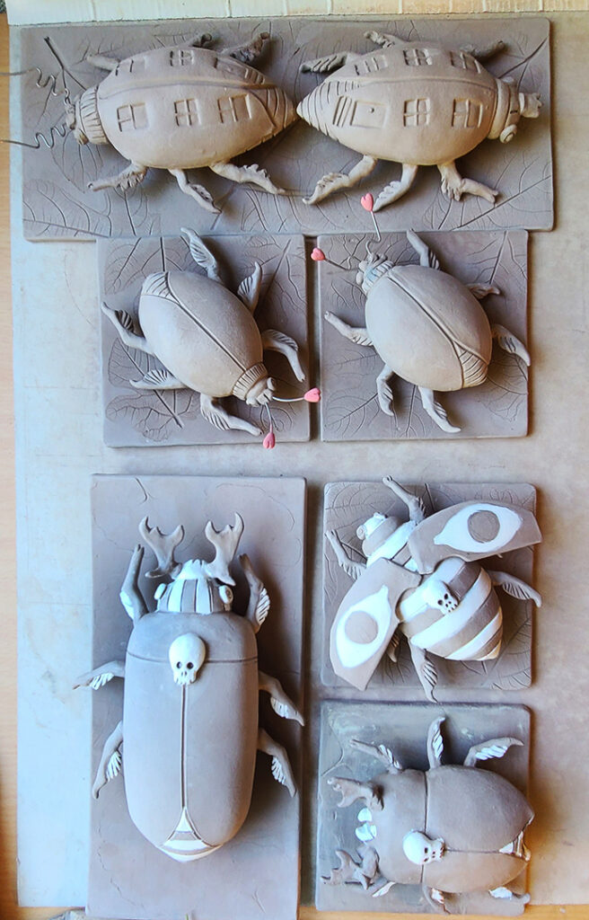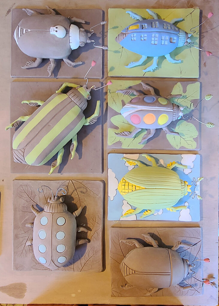 Layers of colors… layered with plenty of Cory whimsy!!! Underglazes bringing the bugs to life…. well, kinda. I can’t wait to see these when they’re finished. And then I get them all so I can add-on my part of the collaboration project!