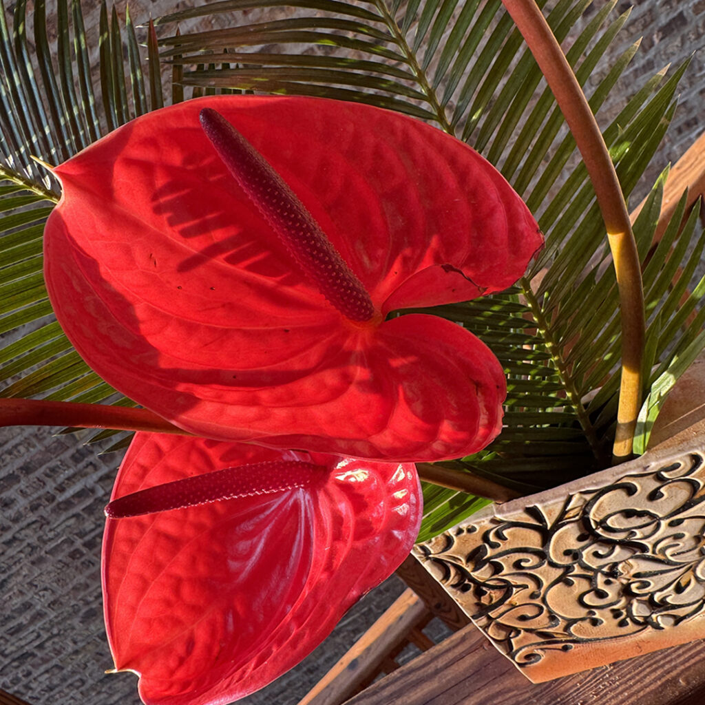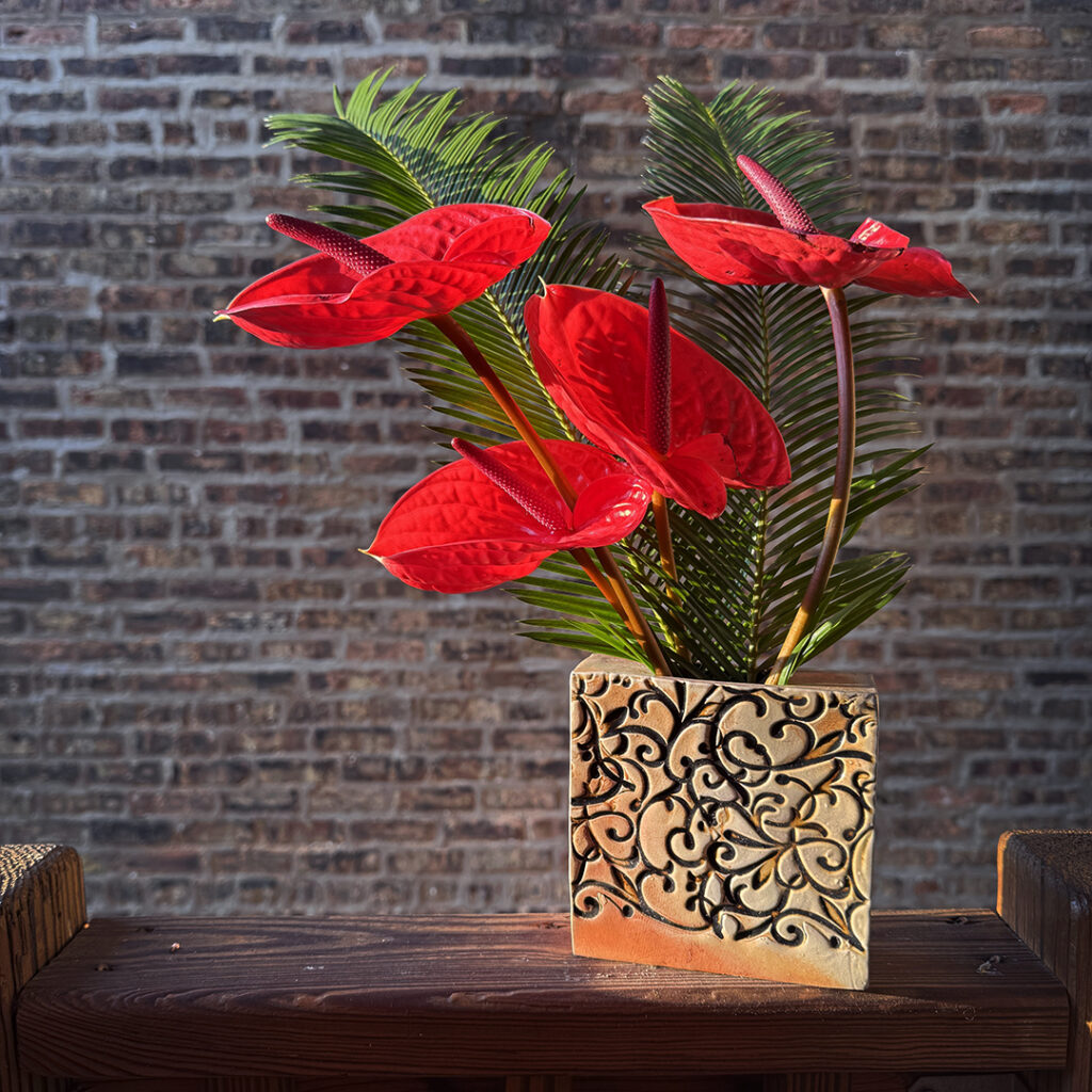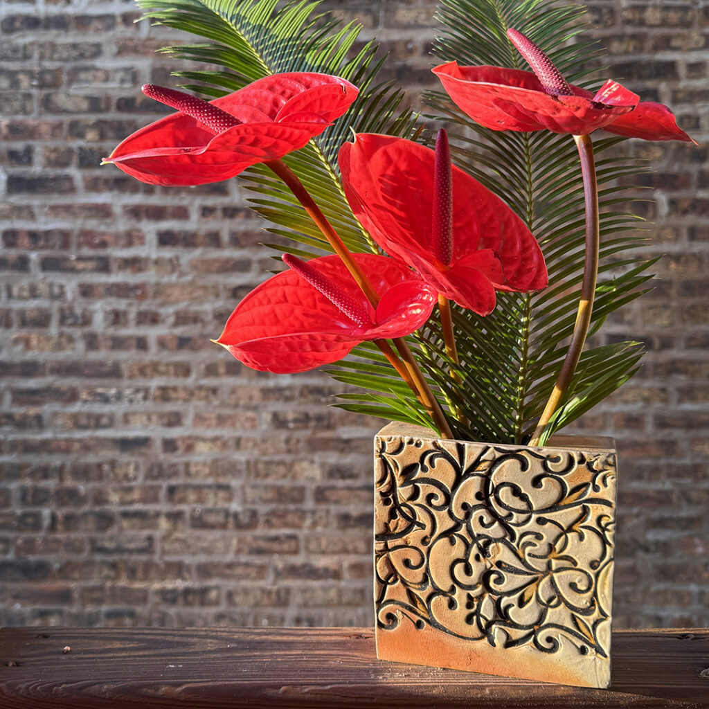 Going a little tropical… with red anthurium & sago palm fronds in a stamped & soda-fire vase. I went with a square vase with a squiggly-scrolly pattern to complement the organic floral.