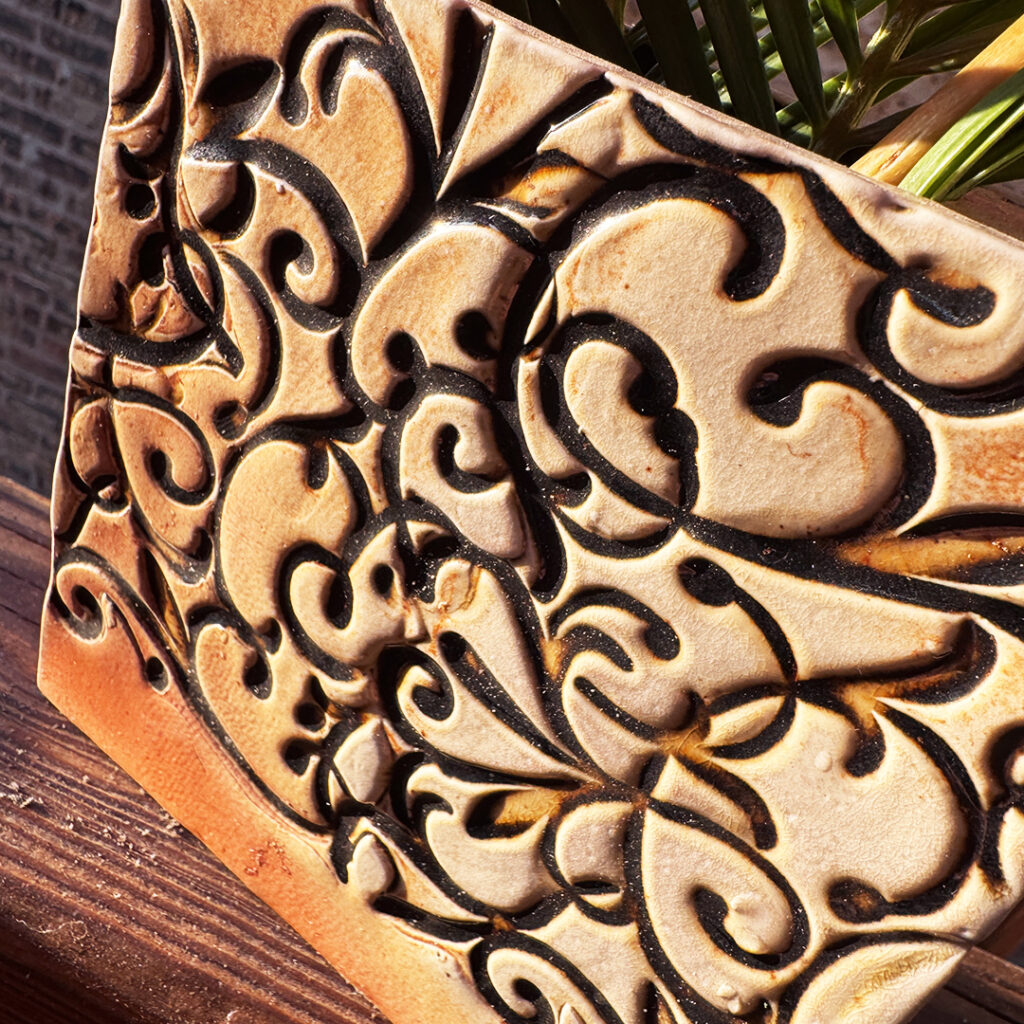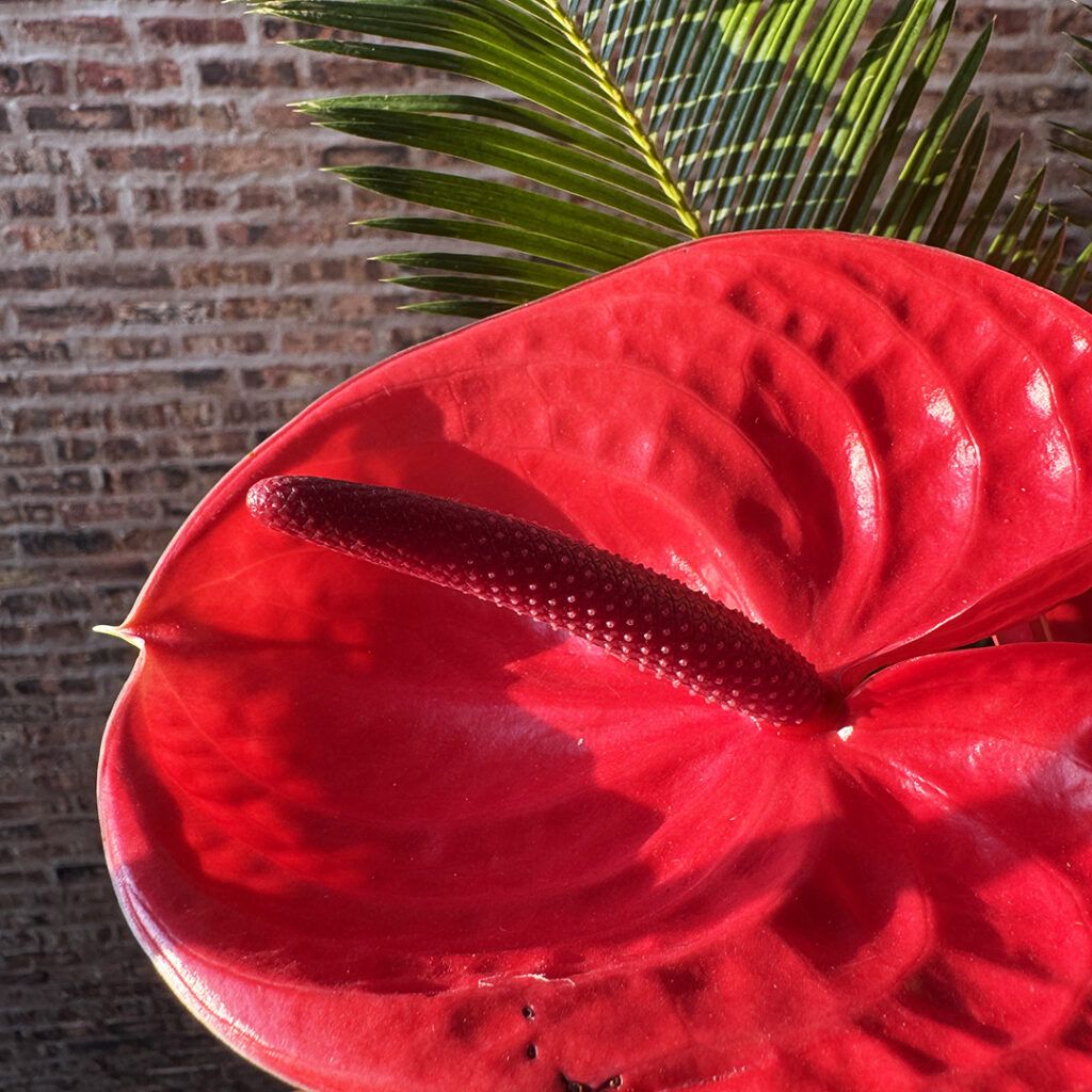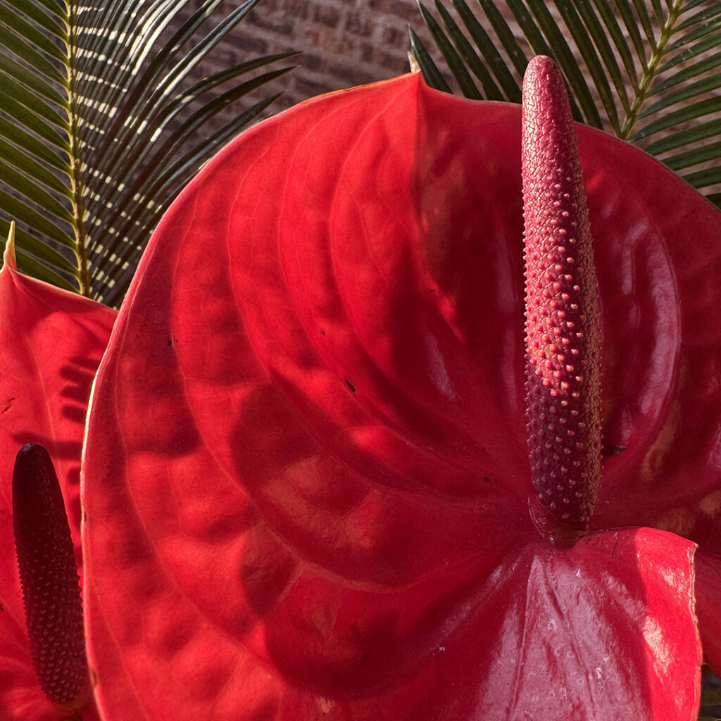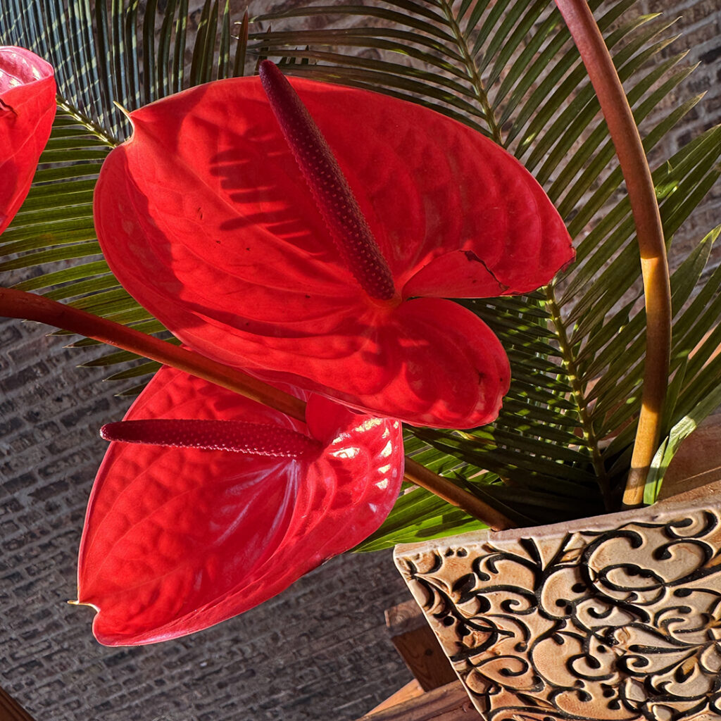 Going a little tropical… with red anthurium & sago palm fronds in a stamped & soda-fire vase. I went with a square vase with a squiggly-scrolly pattern to complement the organic floral.