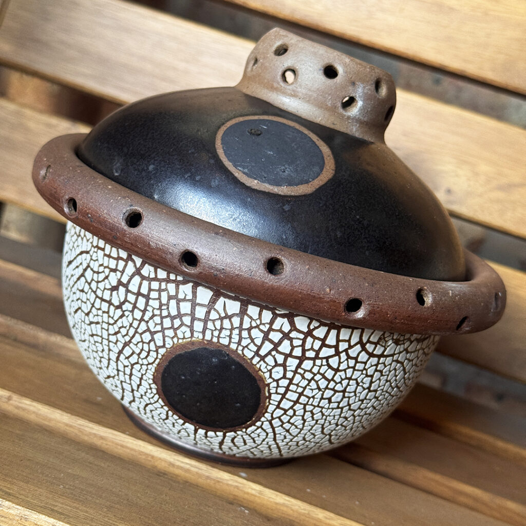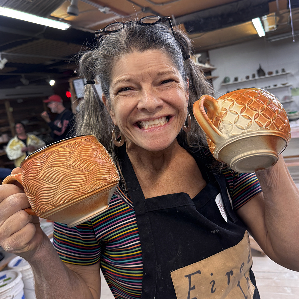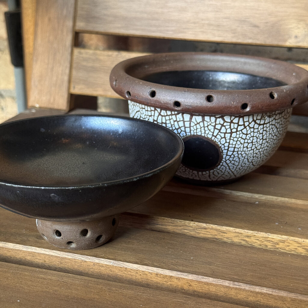At the end of the workshop, AL and I did a little pottery trade!!! I came home with a great lidded bowl. Where the rim is hollow & perforated so it doesn’t get hot… and a lid that flips over to become a bowl. Again, with hollow & perforated knob so it too does not get hot!!! AL went home with two of my hybrid mugs… not so matchy-matchy… but clearly close enough that they just couldn’t be separated from each other!