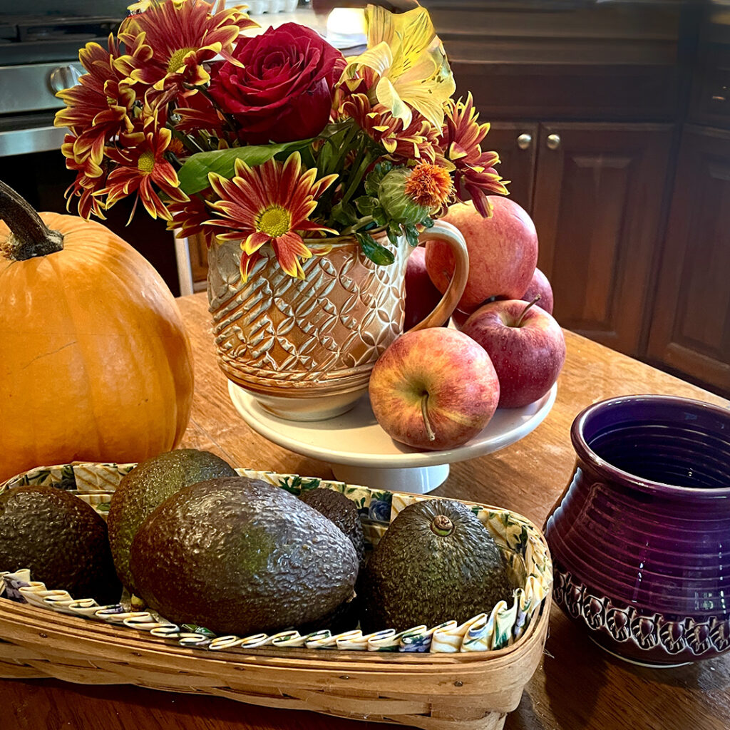 A little Fall collection gracing the kitchen table… flowers, fruits & veggies, pumpkins & MUGS!!! Another perfect way to celebrate Mugshot Monday!!! Thanks for sharing your autumnal display Kelly!!!