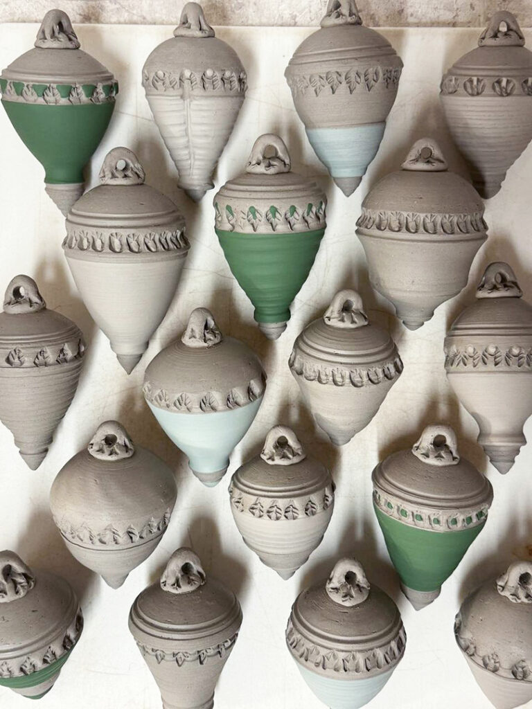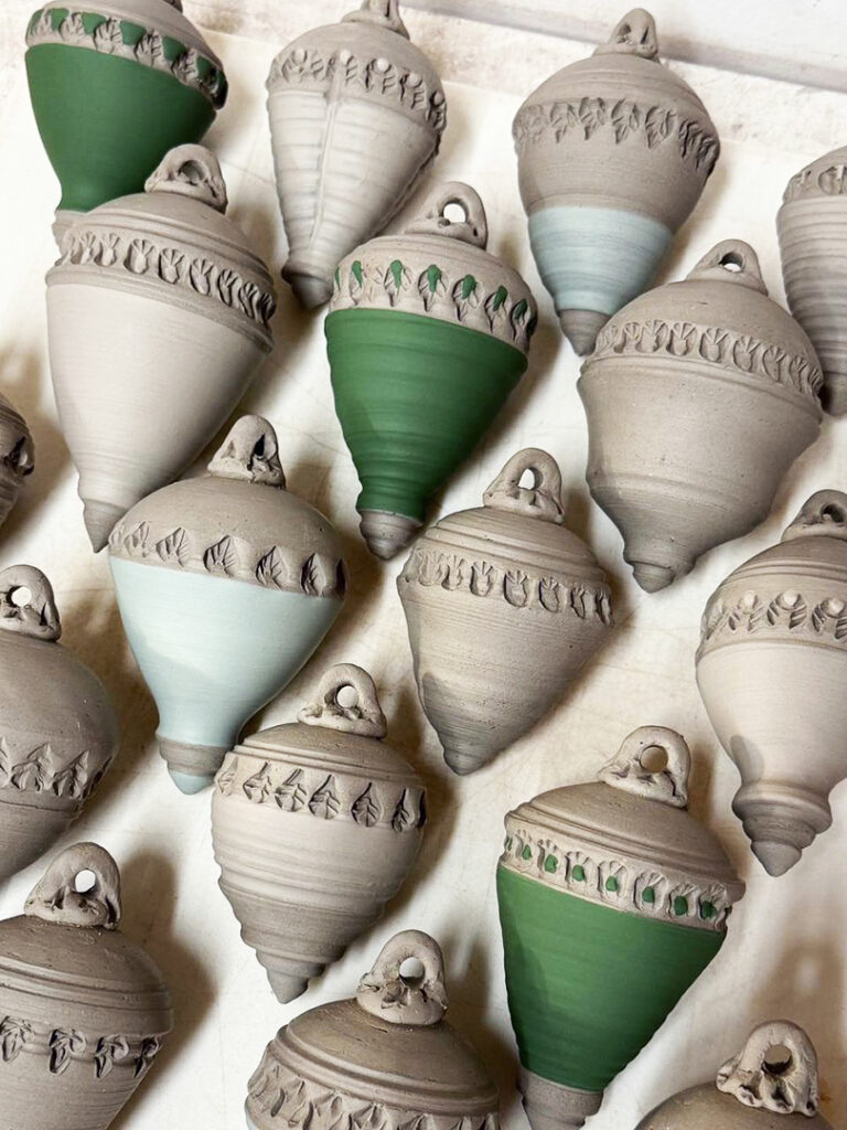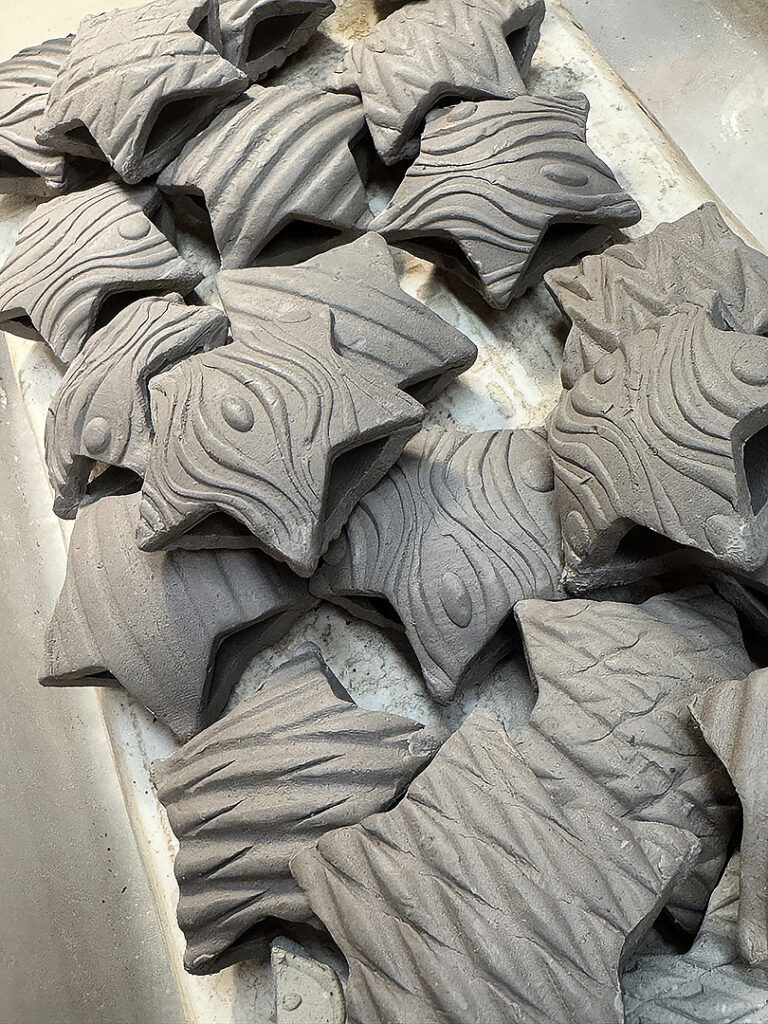 Stamped & slip painted… a new batch of wheelthrown ornaments ready to dry & fire.