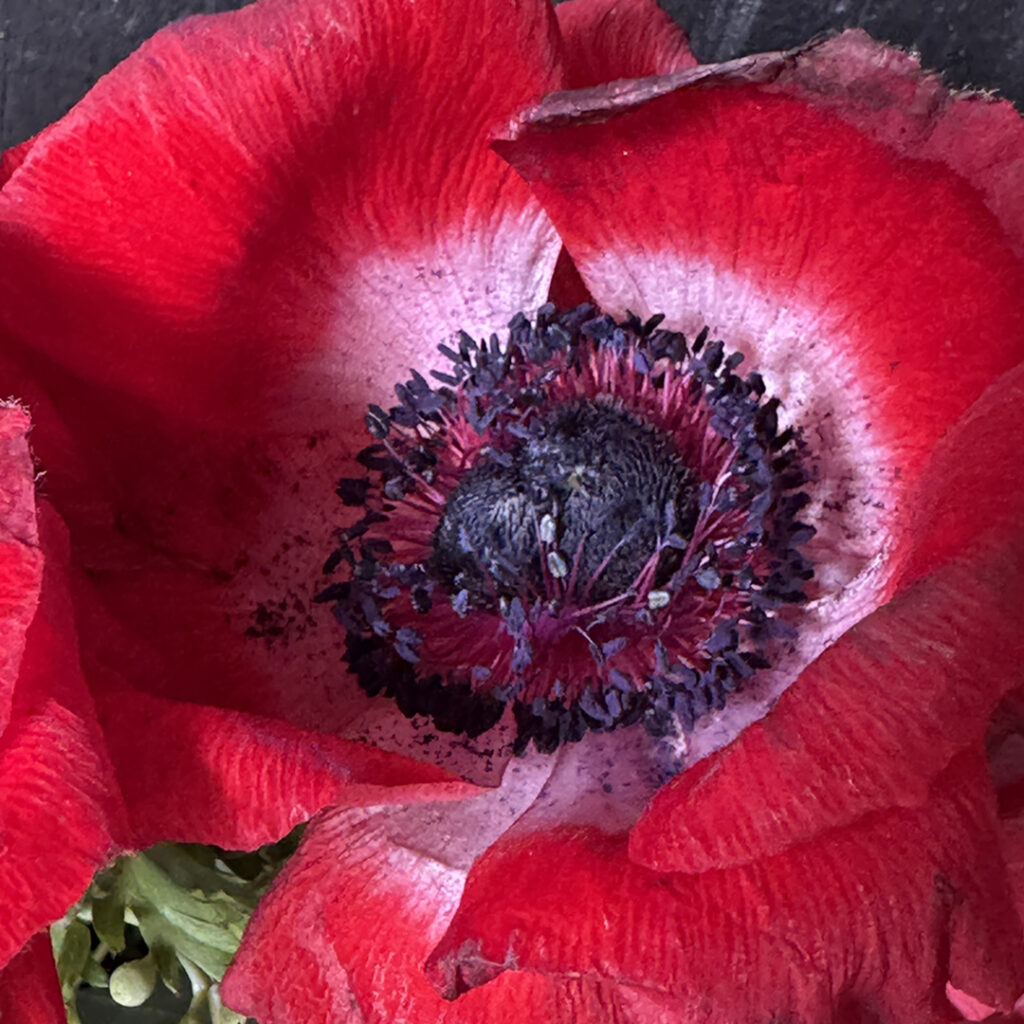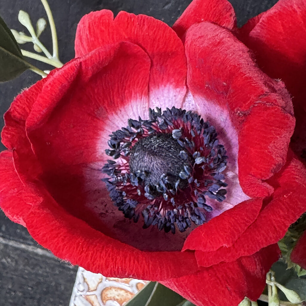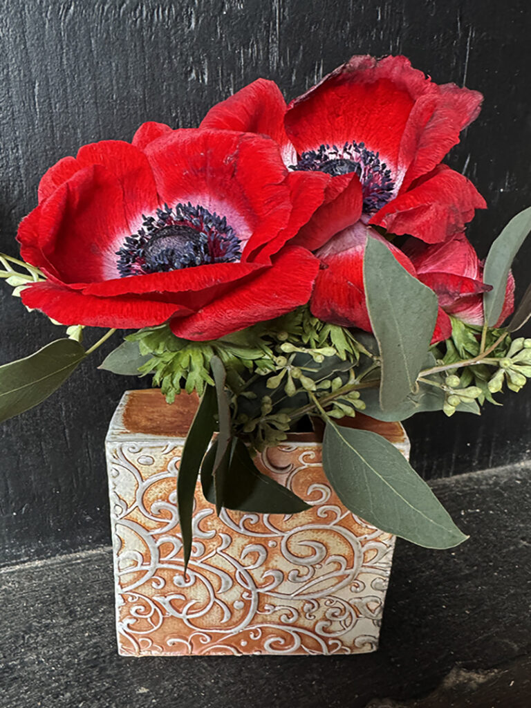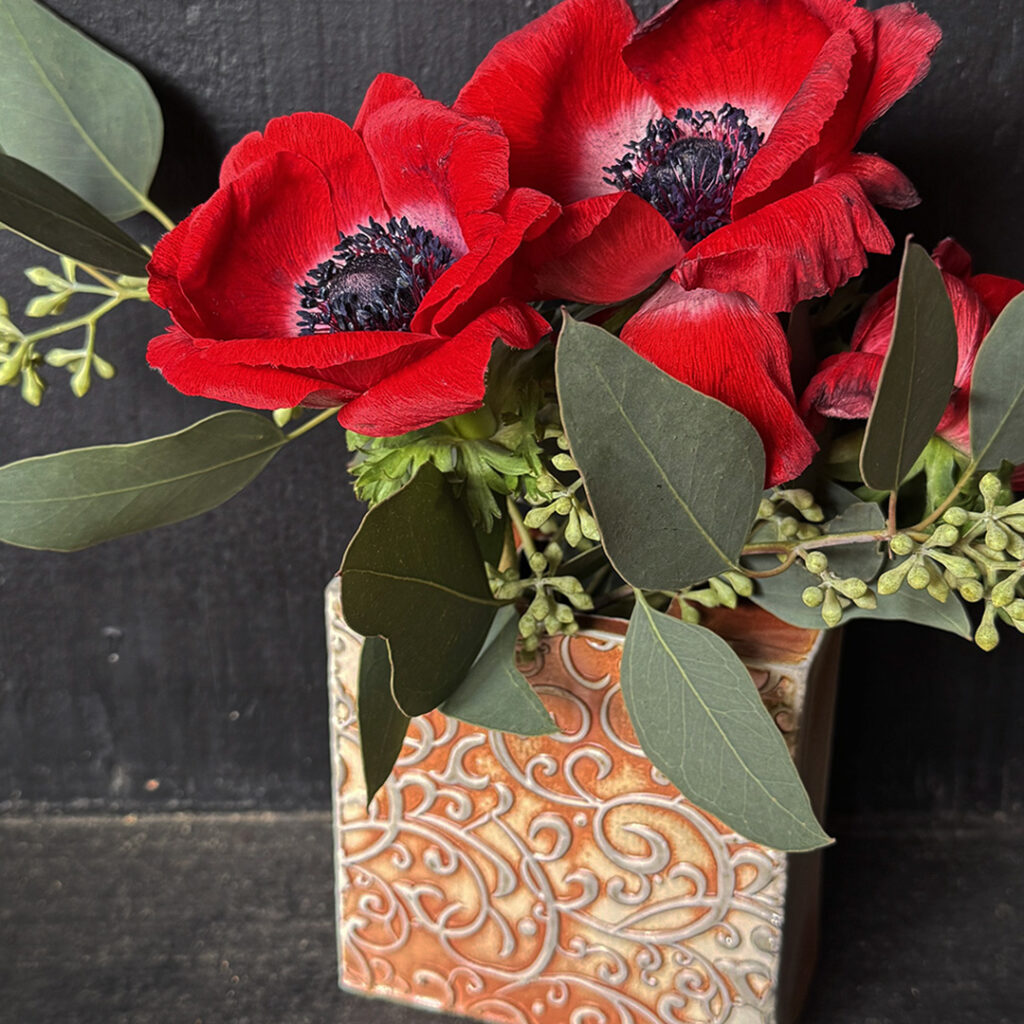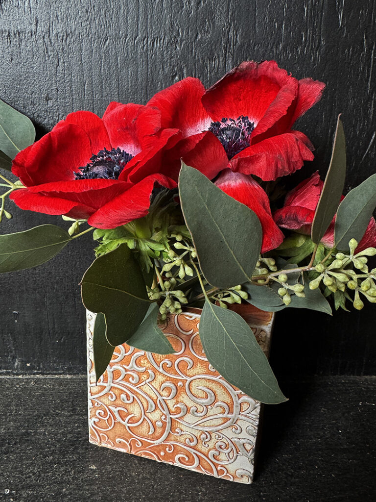 Some pretty red anemone flowers with seeded eucalyptus in a small textured & soda-fired square vase. Loving the scroll pattern & the crazy-cool details in the flower’s center!