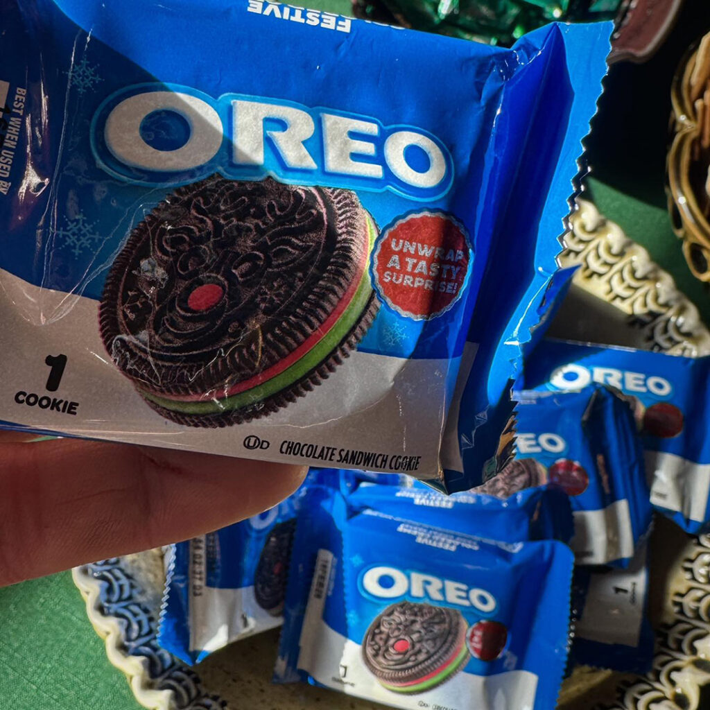 So today was the first day of my HOLIDAY HOME SHOW… and it started out to be a very “sweet” day!!! Especially when some of your customers bring you treats… like these special “festive” OREOs which I’ve never even seen before?! Red & green filling layered between character-stamped cookies!