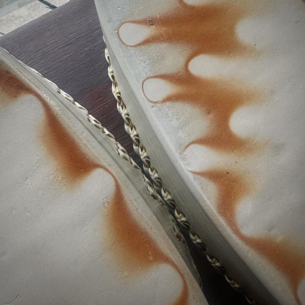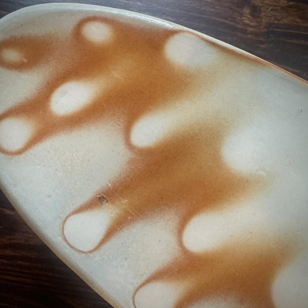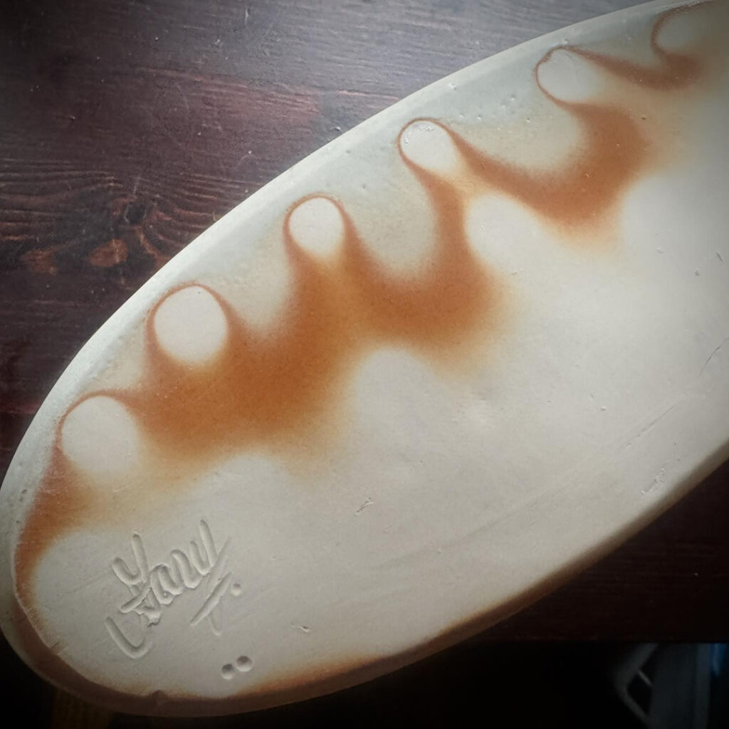 Anyway… I was taken by these fantastic fire flashing marks on the bottom of some large oval vases. As the soda kiln fires & leaves soda-glaze deposits on the pots, some of it sneaks under the pots & leaves wonderful flashing marks. Like these where you can literally see the flame’s path between the wadding that was under the pots during the firing. So cool to see where the flames kissed the pots & left their marks!!! Ahhh… another beauty of soda-firing!!!