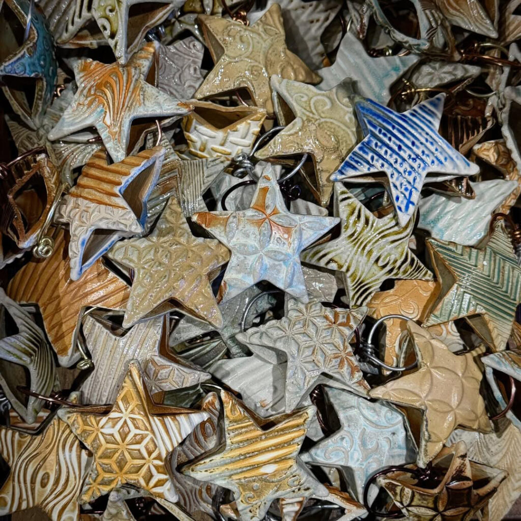 A few more shots of this year’s collection of Holiday Mugs… just in time for this weekend’s HOLIDAY HOME SHOW!!! New stamped & soda-fired mugs with a string of Holiday Lights… as well as some mugs with Christmas Trees & star toppers… kinda like last year’s holiday mugs!