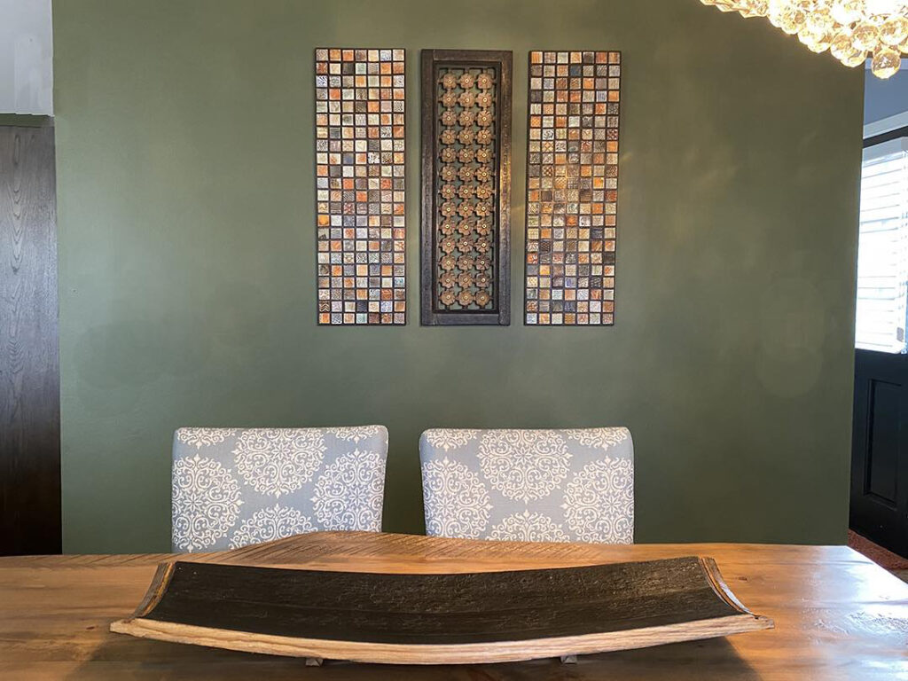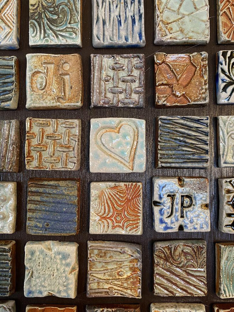 Continuing the celebration of NATIONAL TILE DAY today!!! With another post… this time showing a commission piece I made for Diane & Jim over the past couple months. They brought in a cool wood-carved wall piece they had purchased during a vacation. They decided to augment it with some of my handmade tiles in the form of a ClayQuilt. We discussed some options… and we landed on this triptych design. With my pieces flanking their wood piece for a little more emphasis on their dining room wall. Along with their commissioned tiles… I also made a few “custom” tiles with some initials & significant dates “hidden” amongst the textures!!