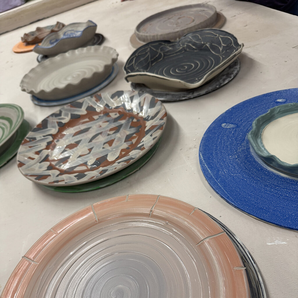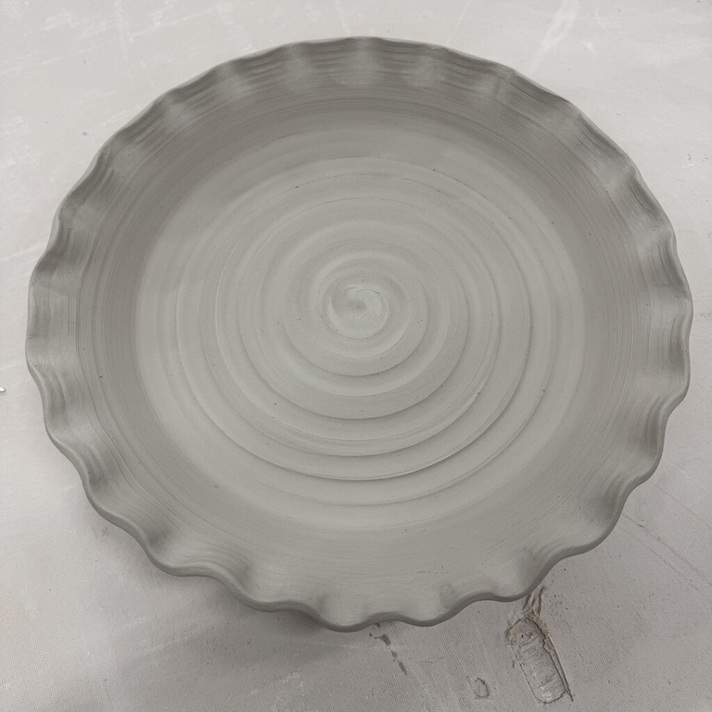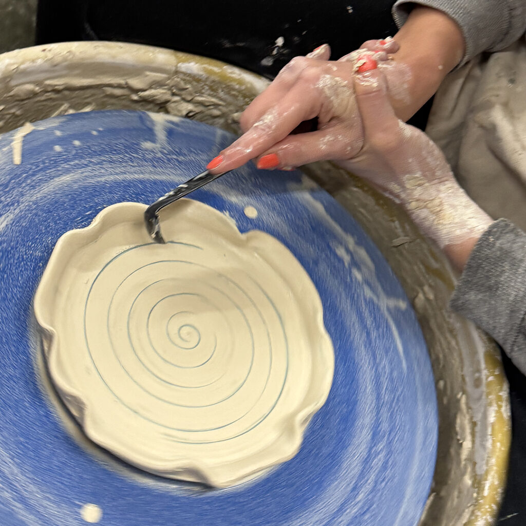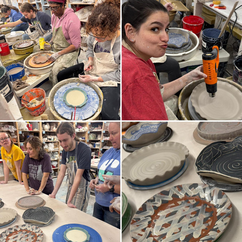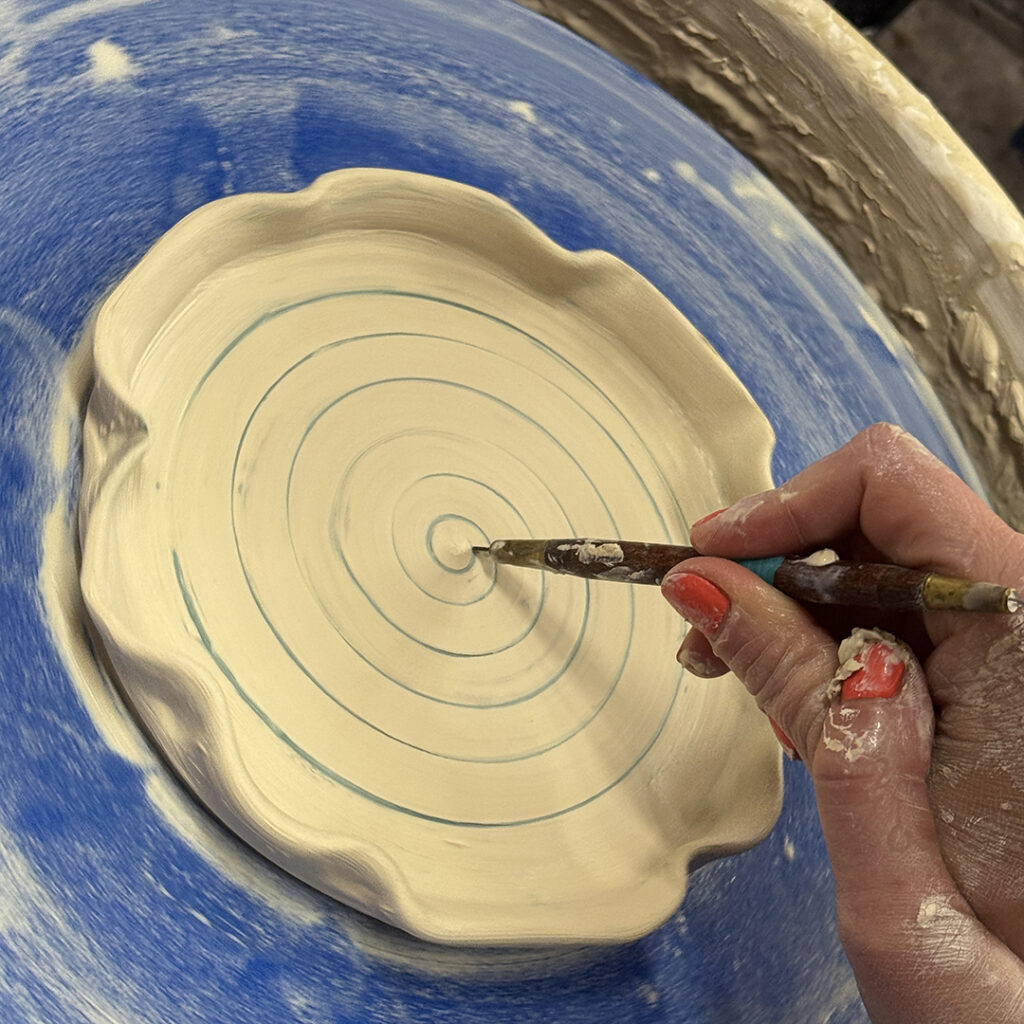 This week in my LILLSTREET THROWDOWN class, we did a decorative platter challenge. Which started with 45 minutes to throw a five-pound platter. Not too tough… until they found out that they had to rotate around to different wheels every ten minutes or so. Picking up wherever the person before them left off. Then after several rounds, they ended back at their original wheel to see what kind of a platter was left for them! Some were very nice… while others may have struggled a bit & ended more with a small salad plate?!