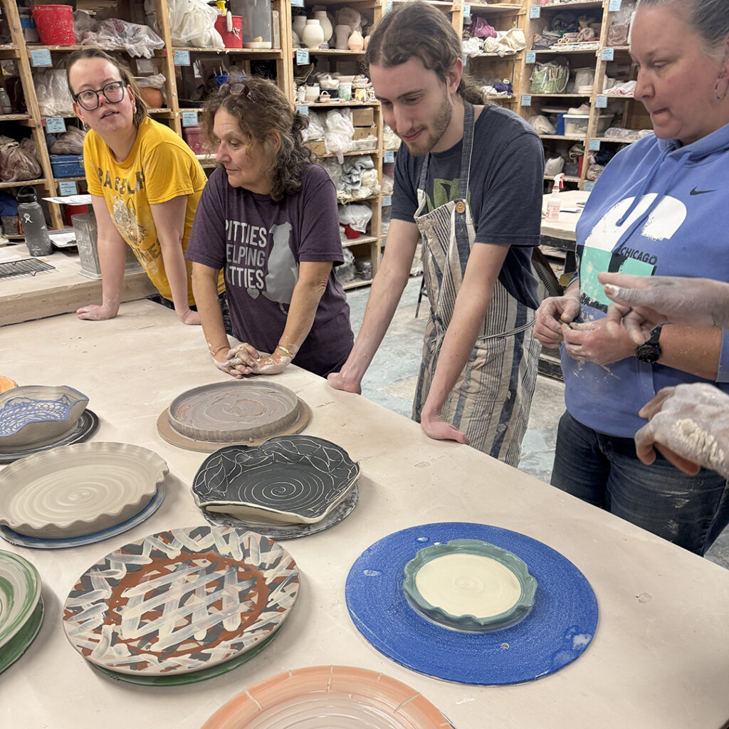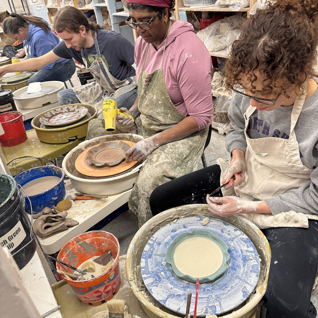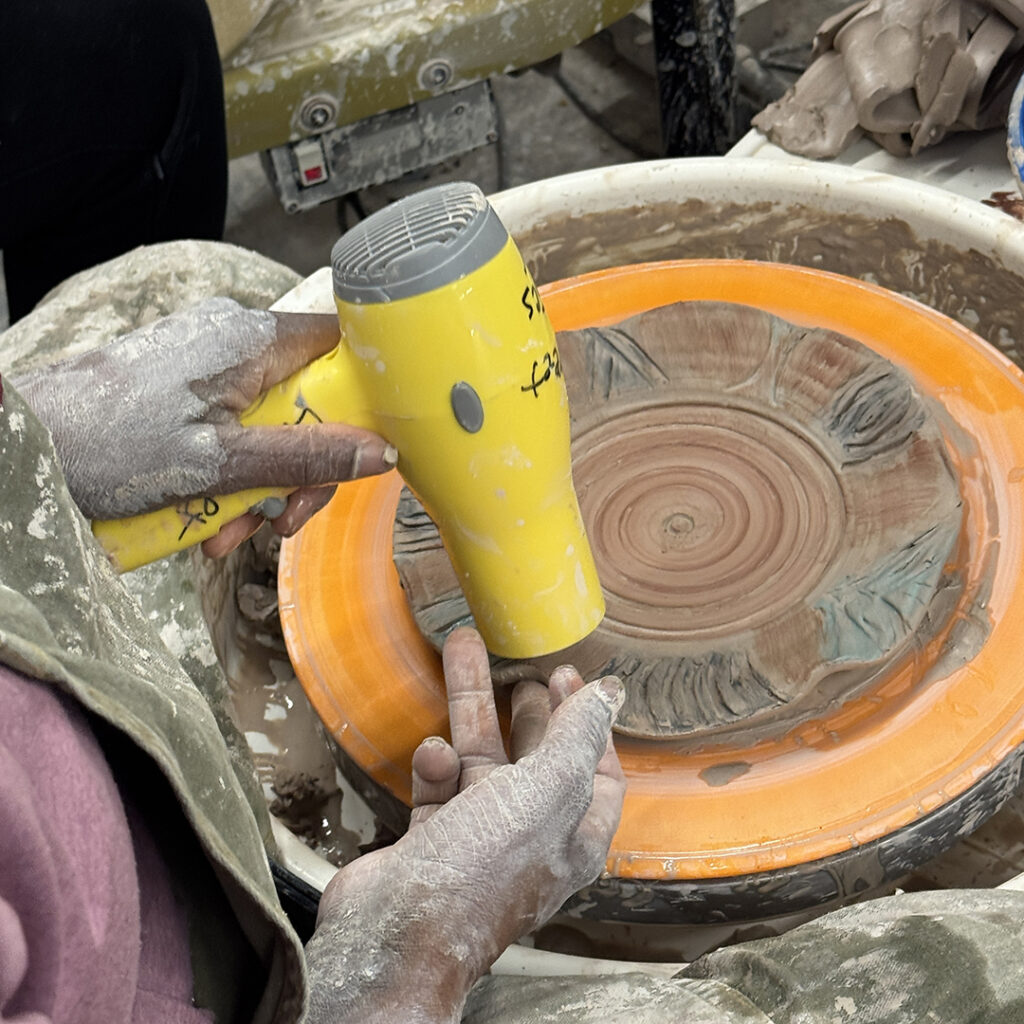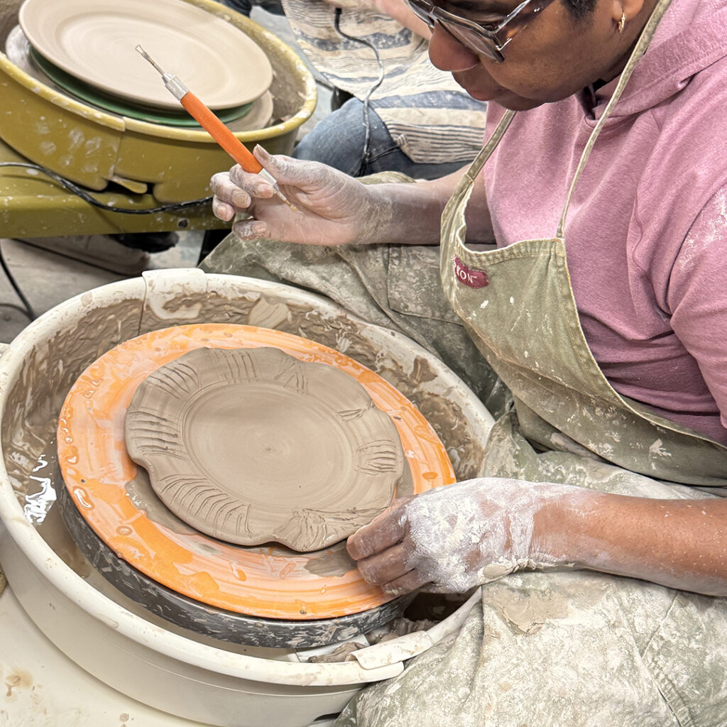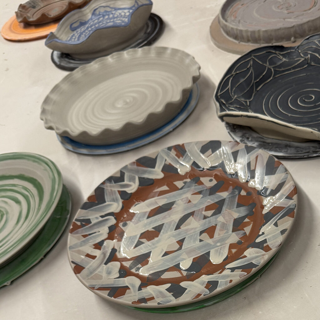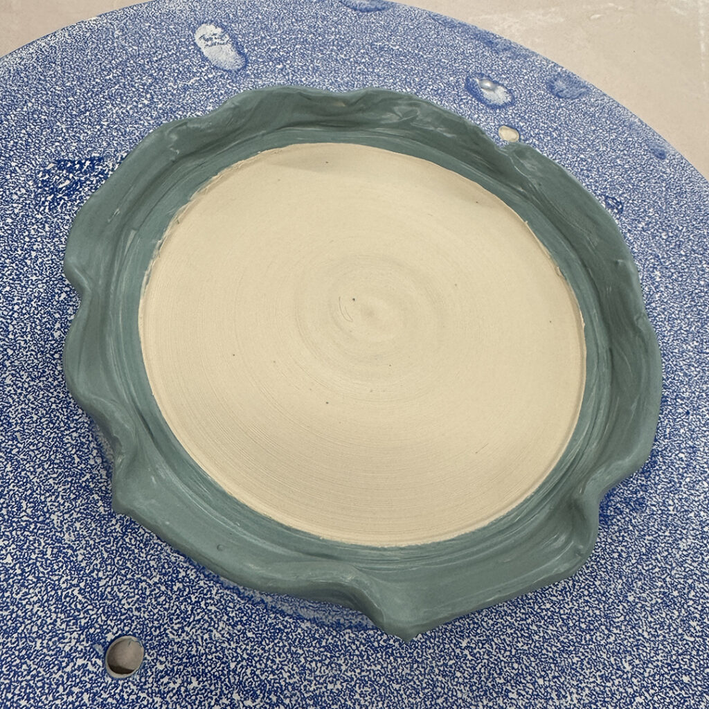 This week in my LILLSTREET THROWDOWN class, we did a decorative platter challenge. Which started with 45 minutes to throw a five-pound platter. Not too tough… until they found out that they had to rotate around to different wheels every ten minutes or so. Picking up wherever the person before them left off. Then after several rounds, they ended back at their original wheel to see what kind of a platter was left for them! Some were very nice… while others may have struggled a bit & ended more with a small salad plate?!