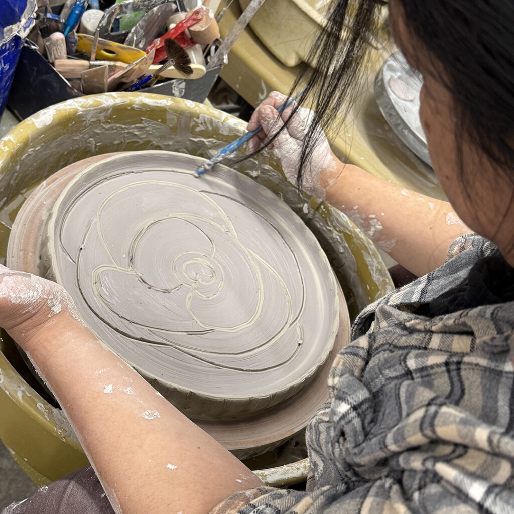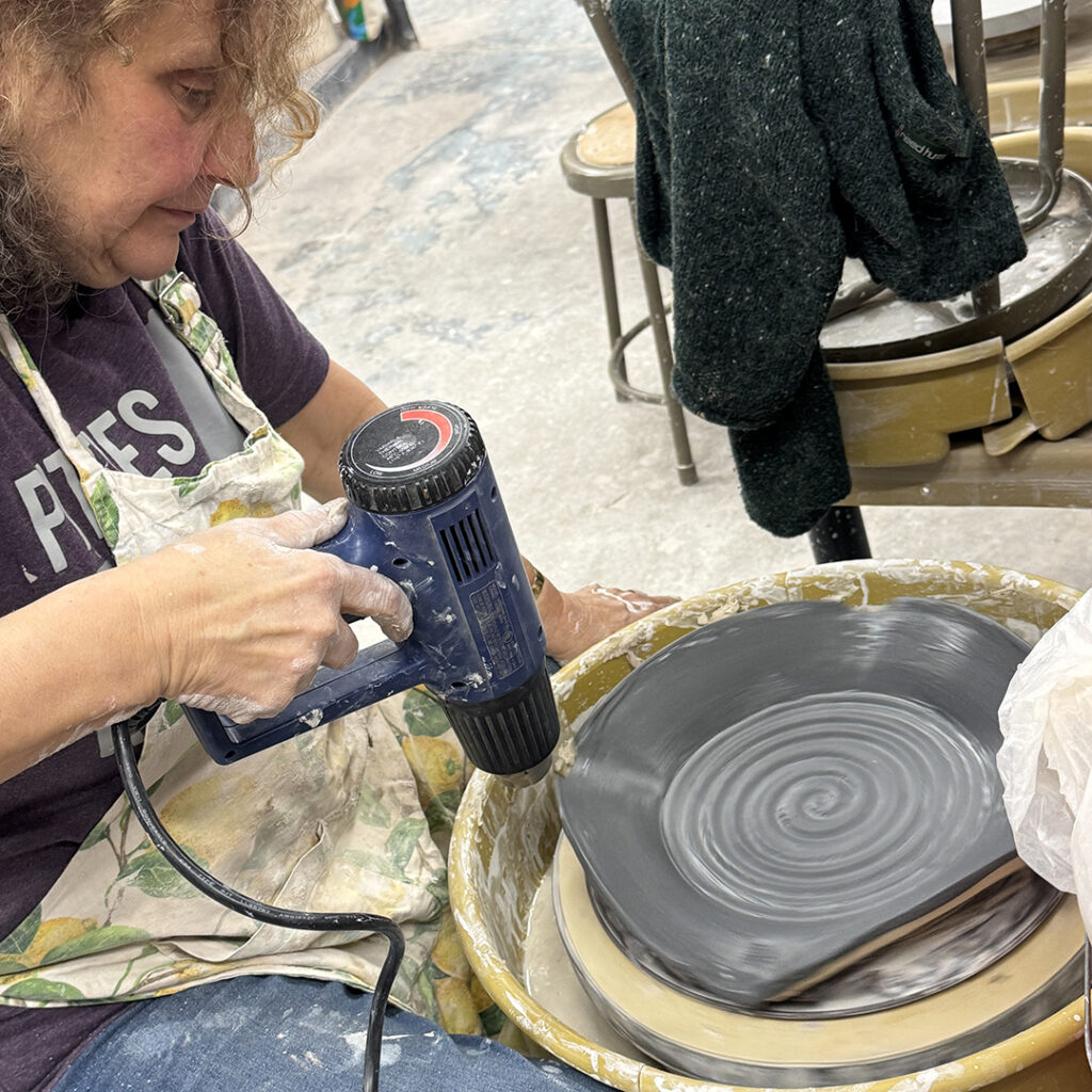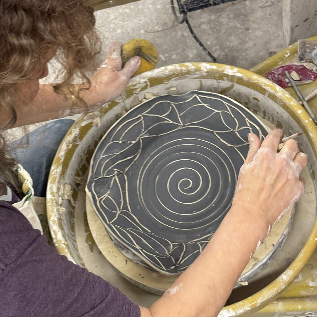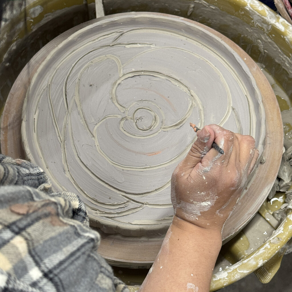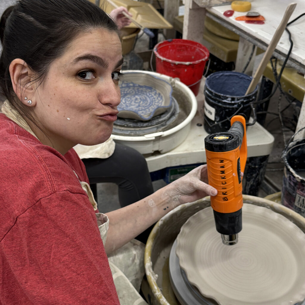 This week in my LILLSTREET THROWDOWN class, we did a decorative platter challenge. Which started with 45 minutes to throw a five-pound platter. Not too tough… until they found out that they had to rotate around to different wheels every ten minutes or so. Picking up wherever the person before them left off. Then after several rounds, they ended back at their original wheel to see what kind of a platter was left for them! Some were very nice… while others may have struggled a bit & ended more with a small salad plate?!