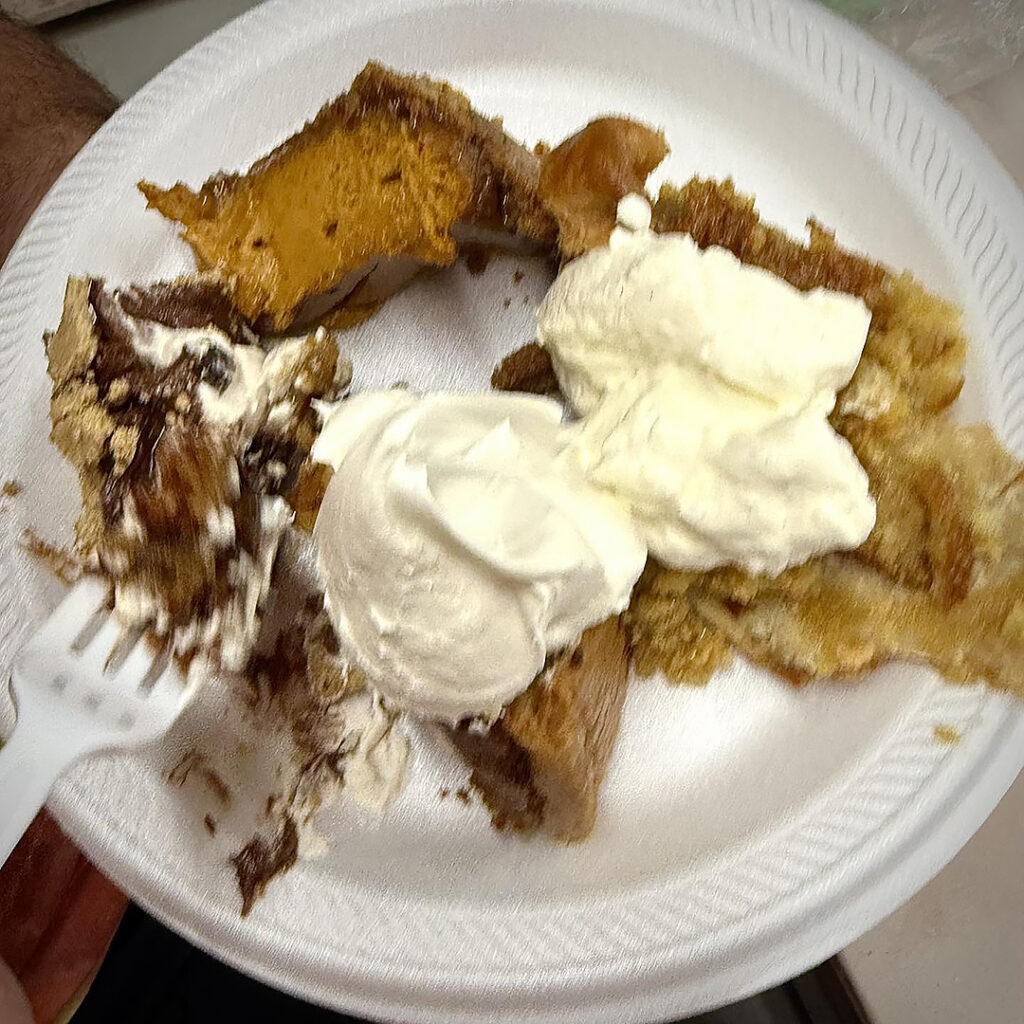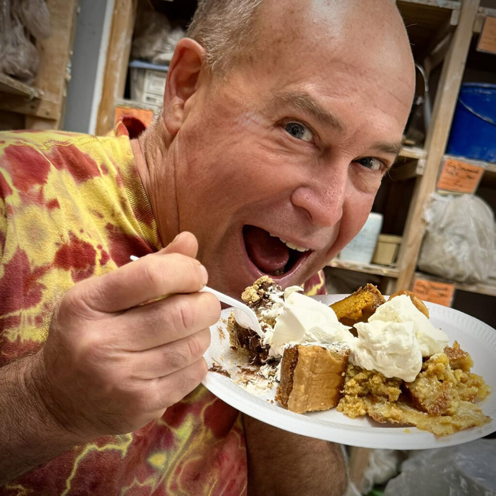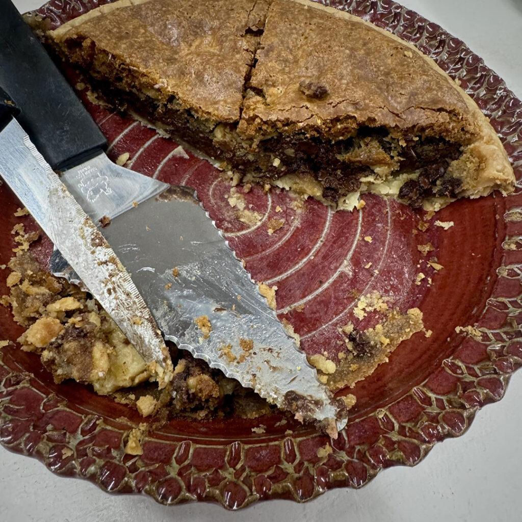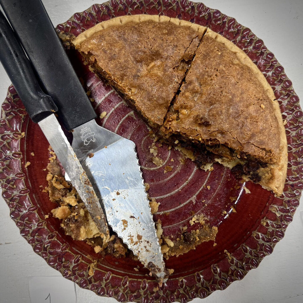 Last night in my Intermediate Wheel class, we celebrated the final class of our Fall session with a fun potluck & trading/stealing game. The category was handmade pie plates… with your potluck food baked inside! Needless to say… we had PLENTY of pie… and I was one happy camper with the palate of a four year old. No such thing as too many pies!!! Chocolate Cream, Spiced Pumpkin, Salted Caramel, Strawberry Cream & more. I made a Tollhouse Chocolate Chip Pie in my red stamped pie plate… which Claire won & took home along with the yummy leftovers!
