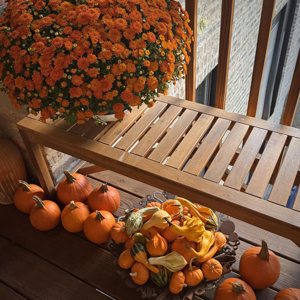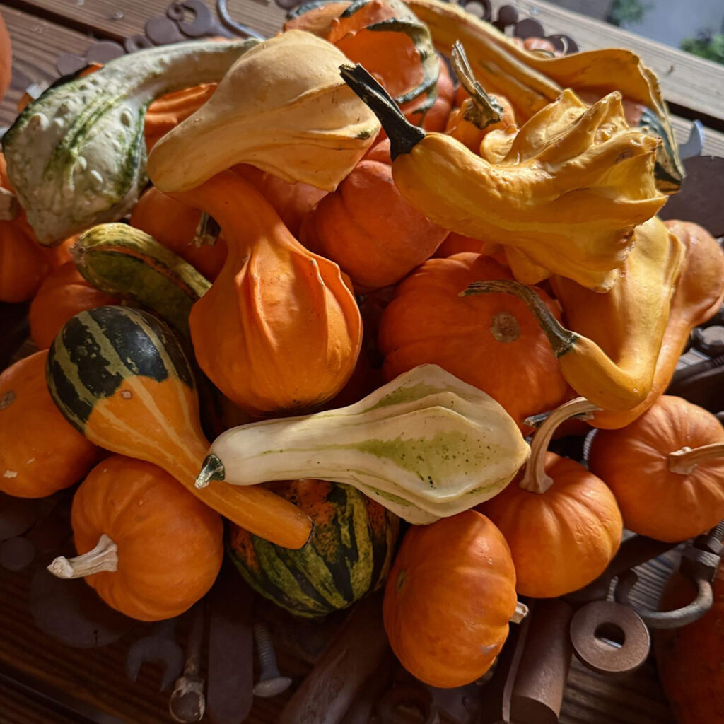 Fall is here… and ORANGE is my favorite color! So I’m excited that my back porch has taken on a new autumn appearance! Thanks to the folks at ART IN THE BARN who decorate the art fair grounds with mums, pumpkins & gourds…and then sell them off at the end as a fundraiser for the hospital auxiliary board. I was there for it… I mean… ORANGE