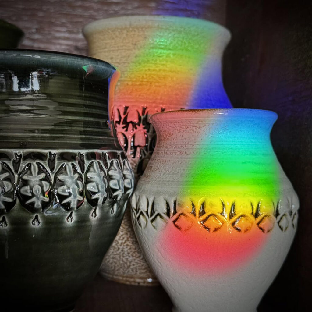 Gotta love when the sun comes streaming in… and a prism rainbow lands perfectly on some vases on the shelves in my dining room! So much fun… makes me think it’s warm & sunny outside?… well, one out of two ain’t bad!!!