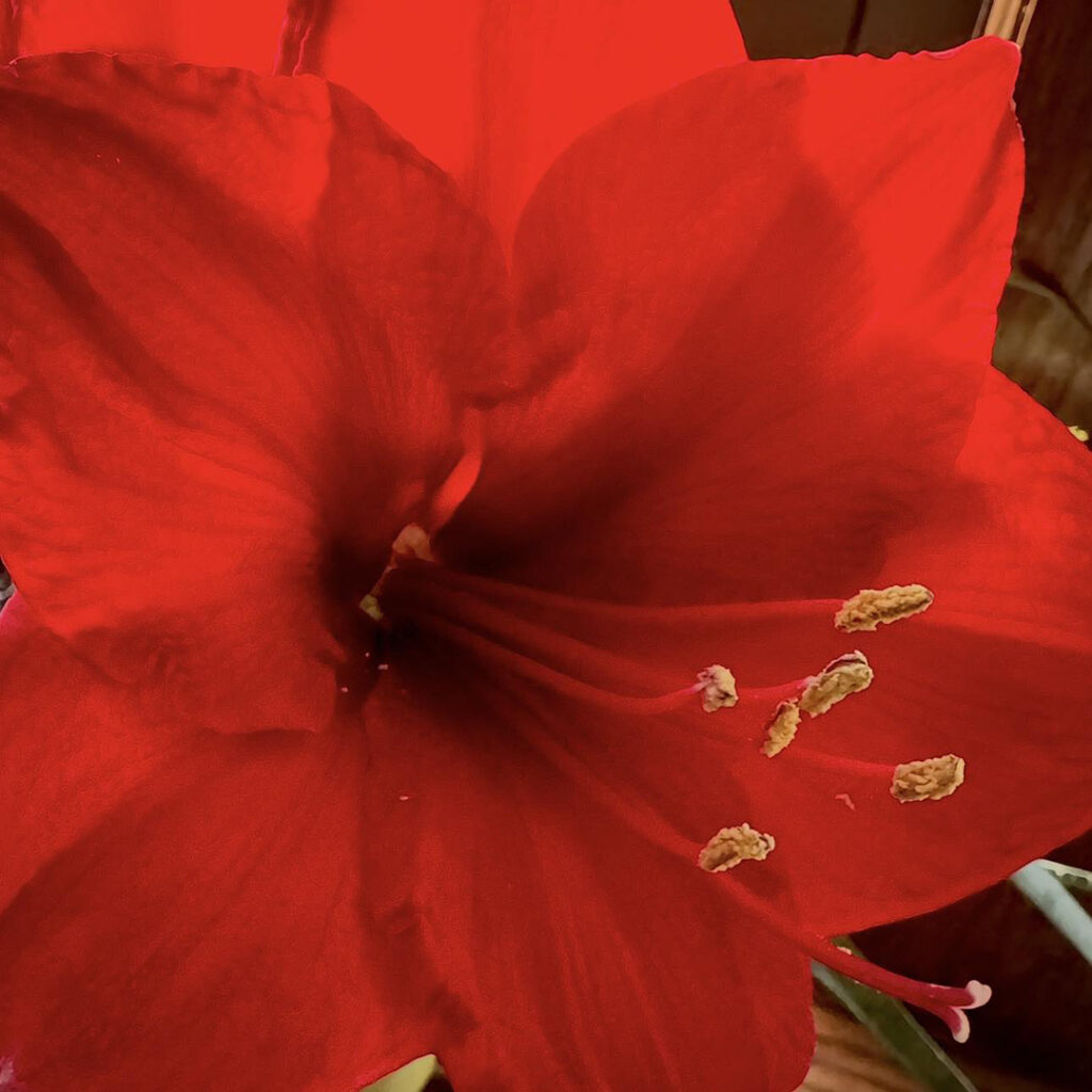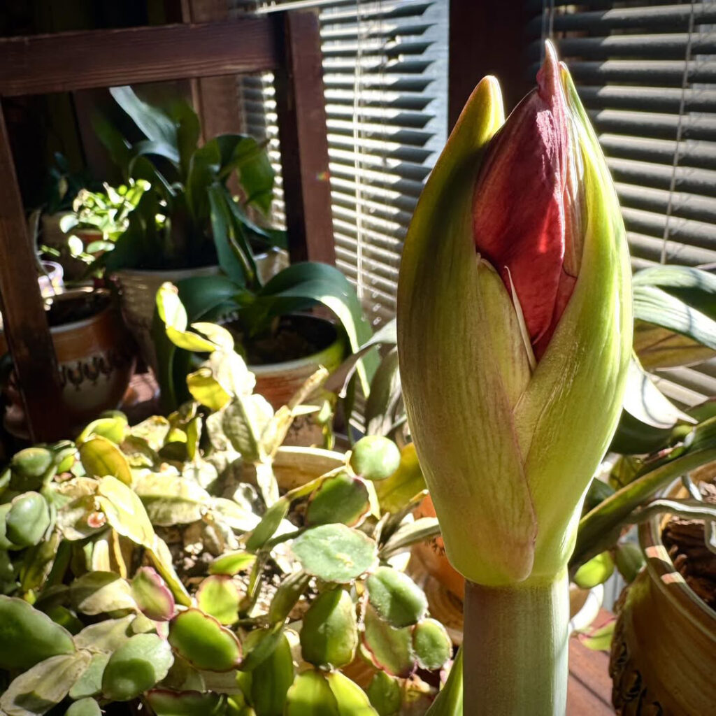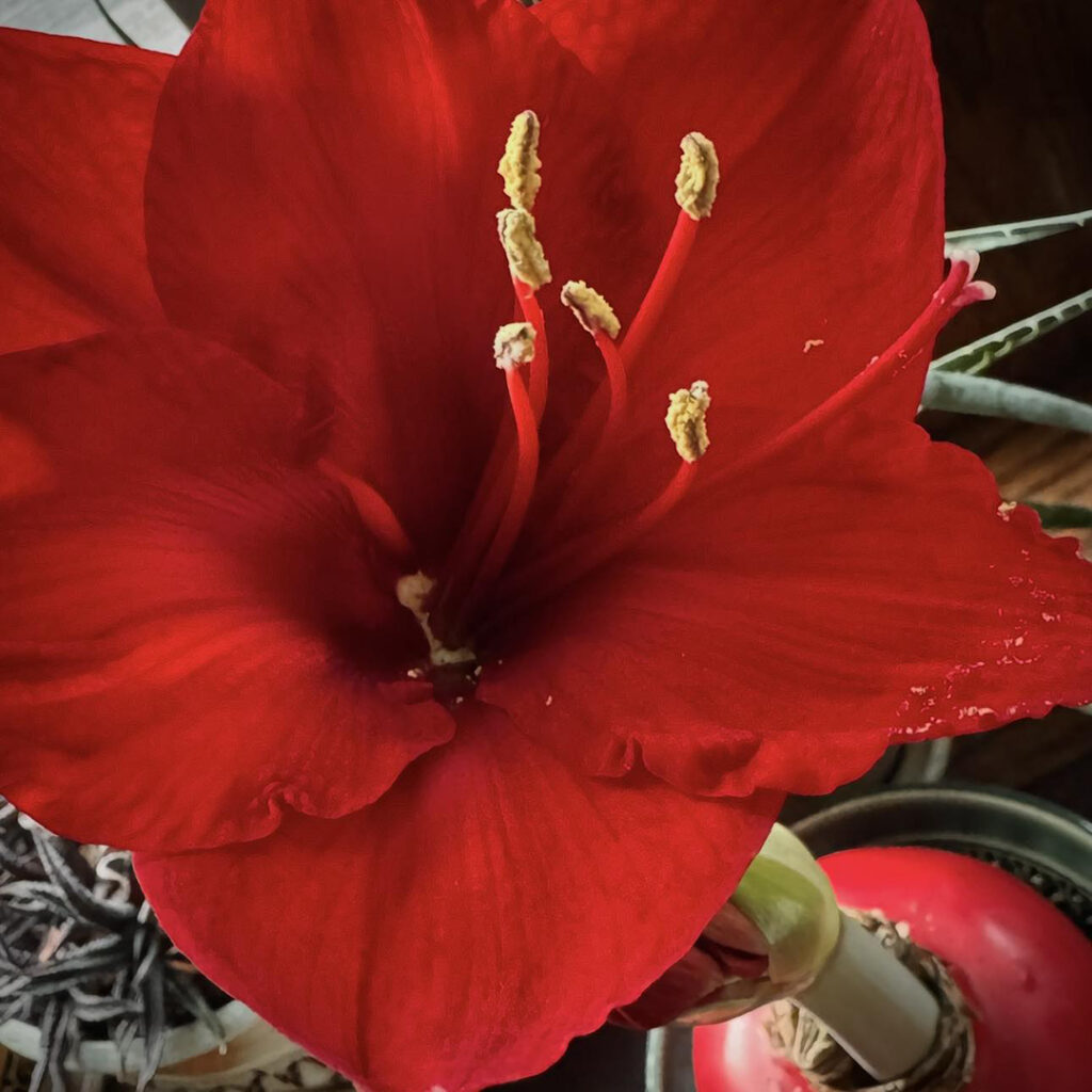 Morning sun streaming in… catching a wonderful pop of red as my waxed amaryllis bulb is in full bloom!!!