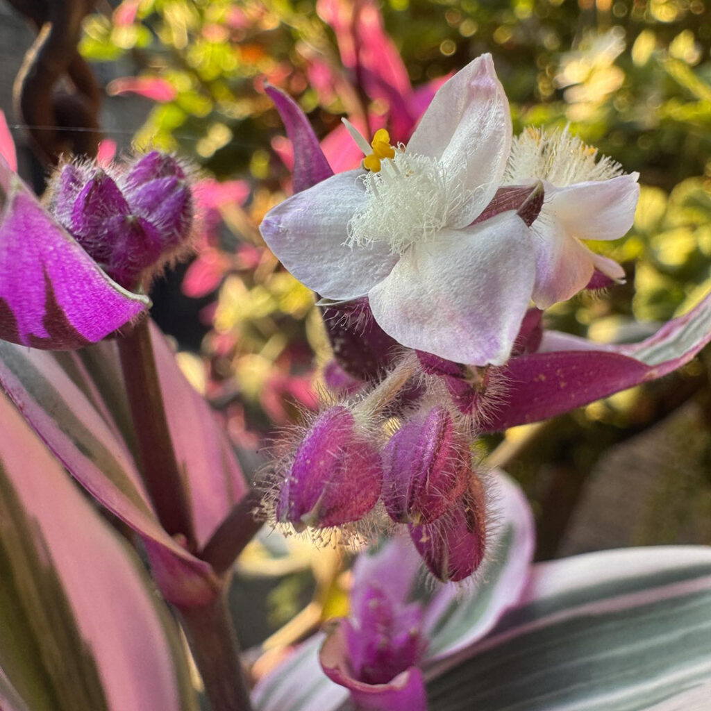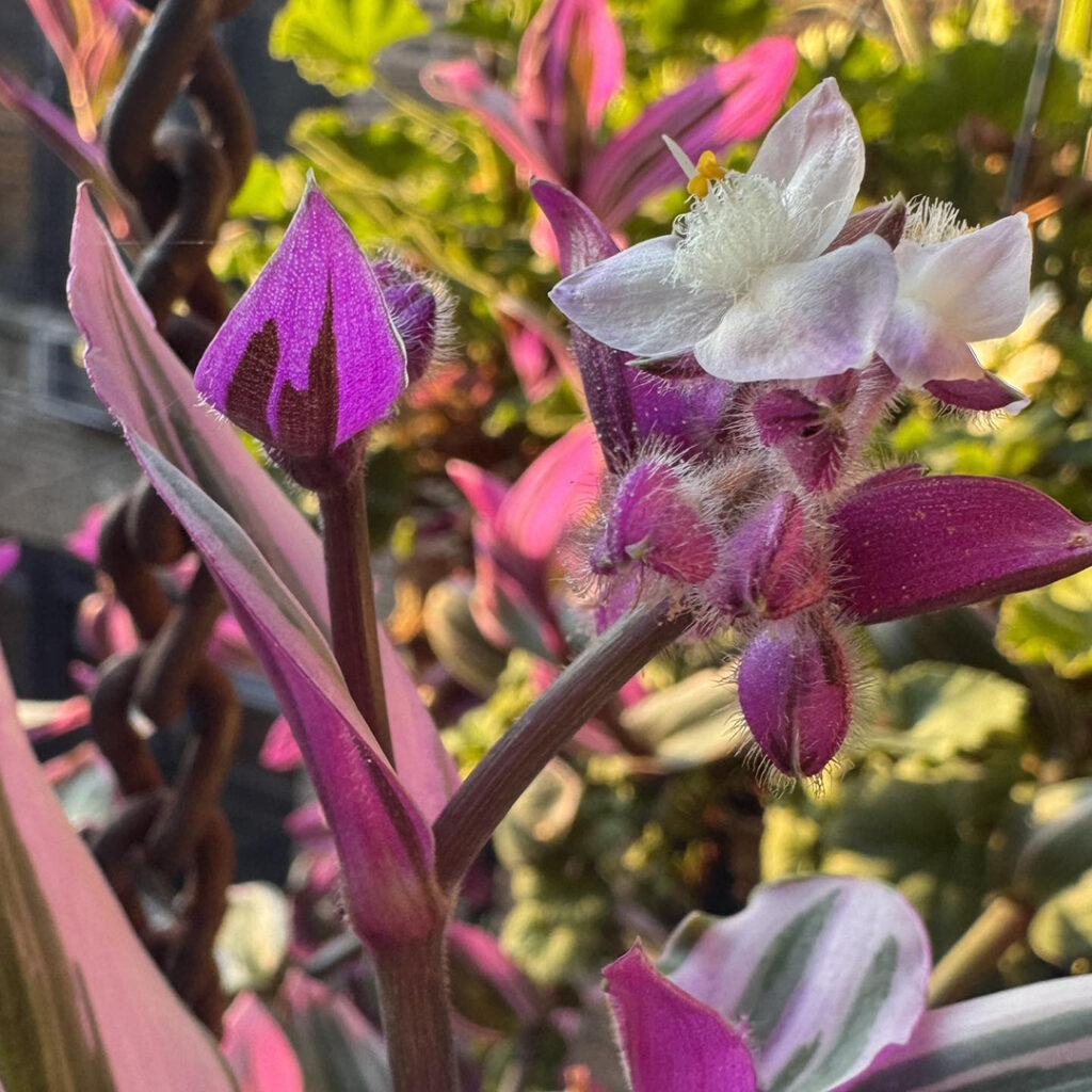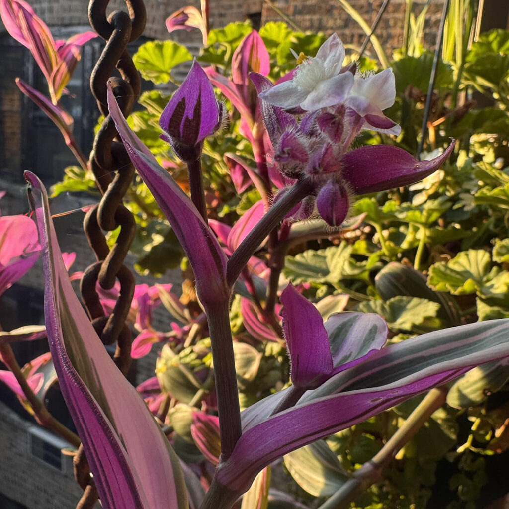 Morning sun streaming onto my back porch. Highlighting this fun plant in a hanging container. Not sure what it is?… but I’m enjoying the bright pop of color & the new little flowers that just started blooming. I’m happy… and the plant looks happy too!
