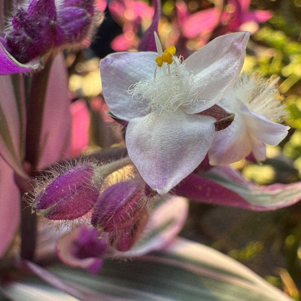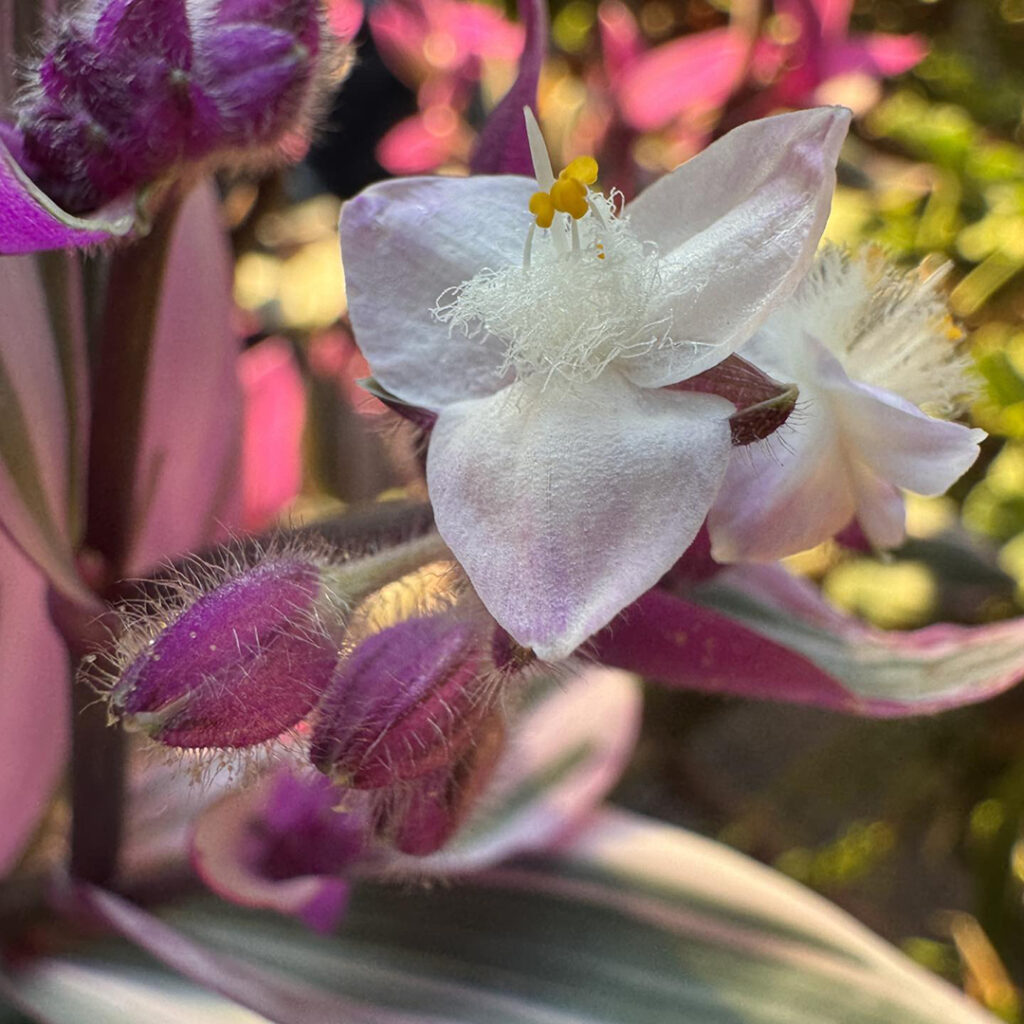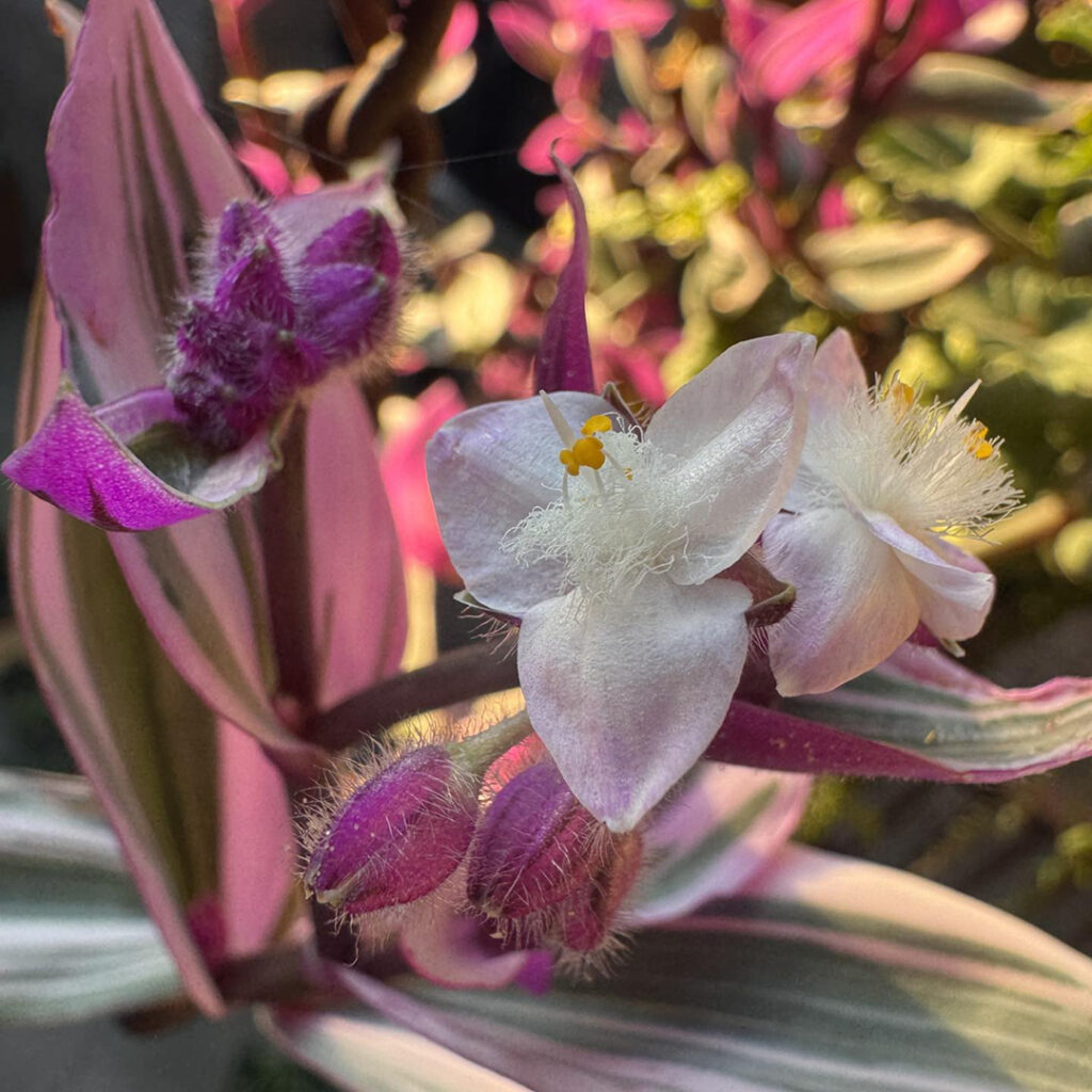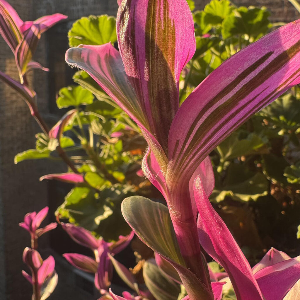 Morning sun streaming onto my back porch. Highlighting this fun plant in a hanging container. Not sure what it is?… but I’m enjoying the bright pop of color & the new little flowers that just started blooming. I’m happy… and the plant looks happy too!