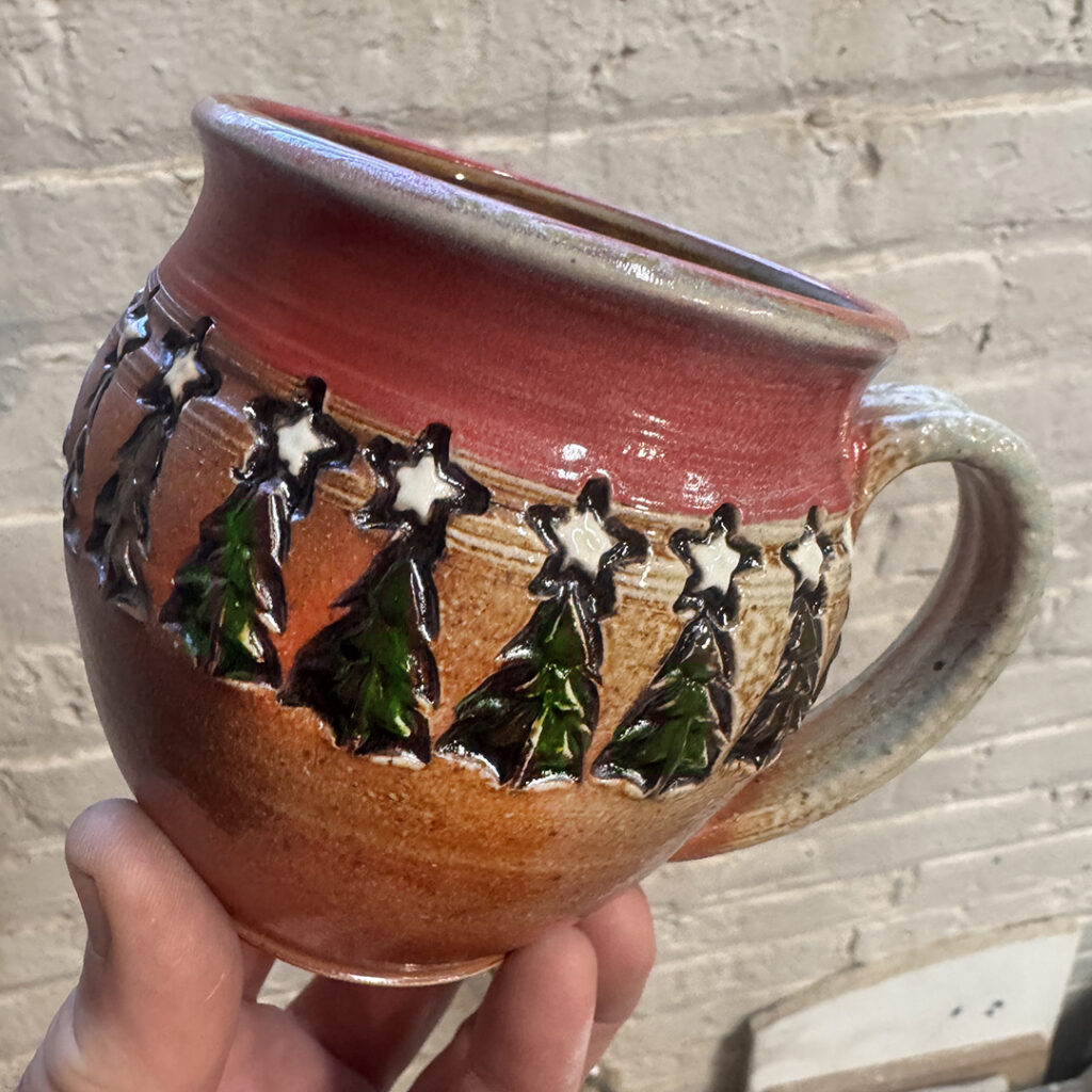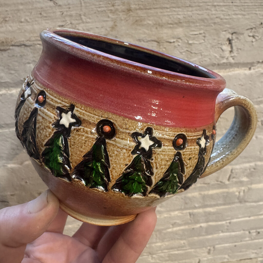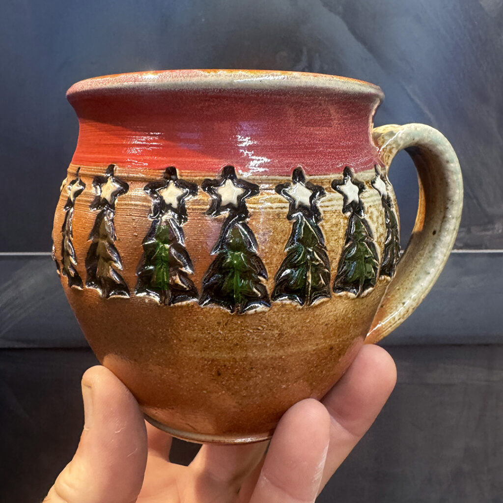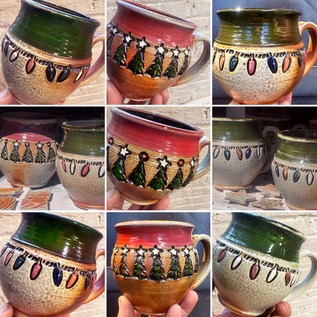 A few more shots of this year’s collection of Holiday Mugs… just in time for this weekend’s HOLIDAY HOME SHOW!!! New stamped & soda-fired mugs with a string of Holiday Lights… as well as some mugs with Christmas Trees & star toppers… kinda like last year’s holiday mugs!