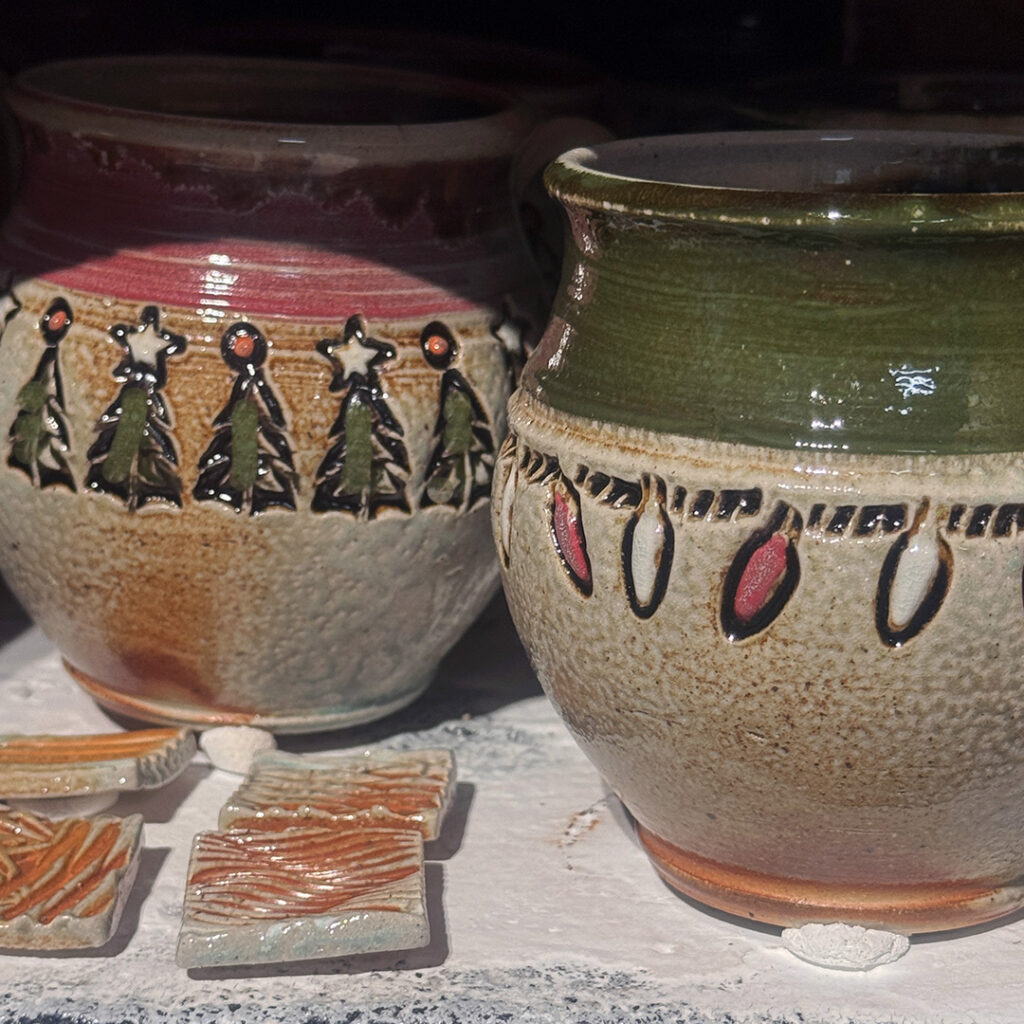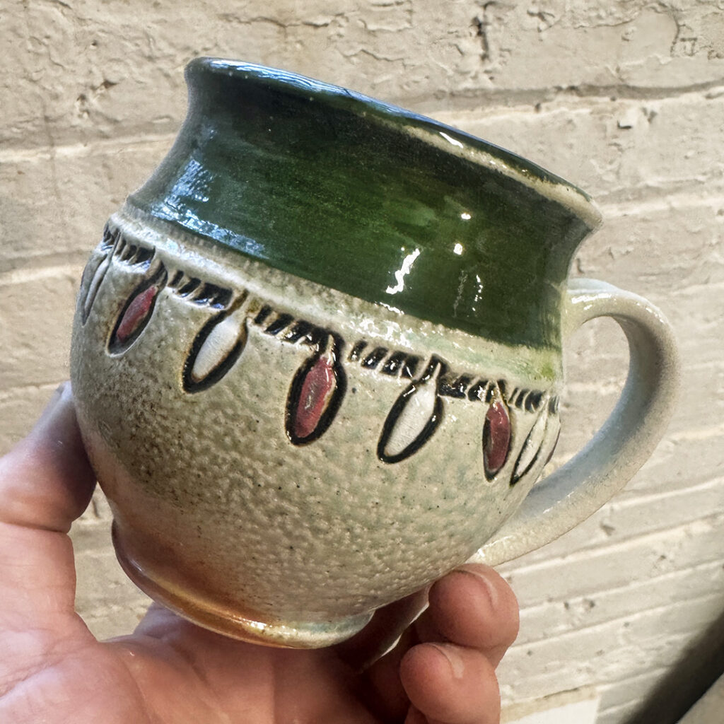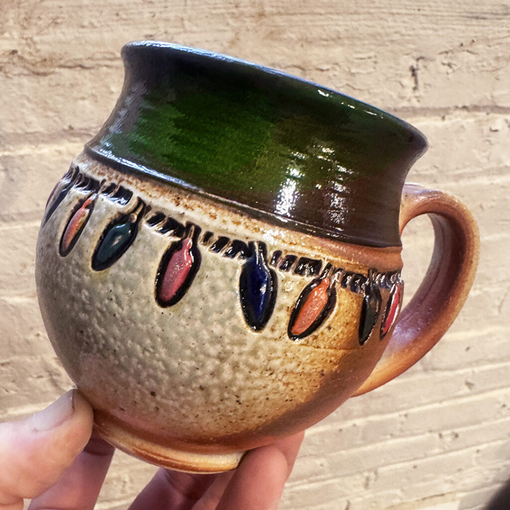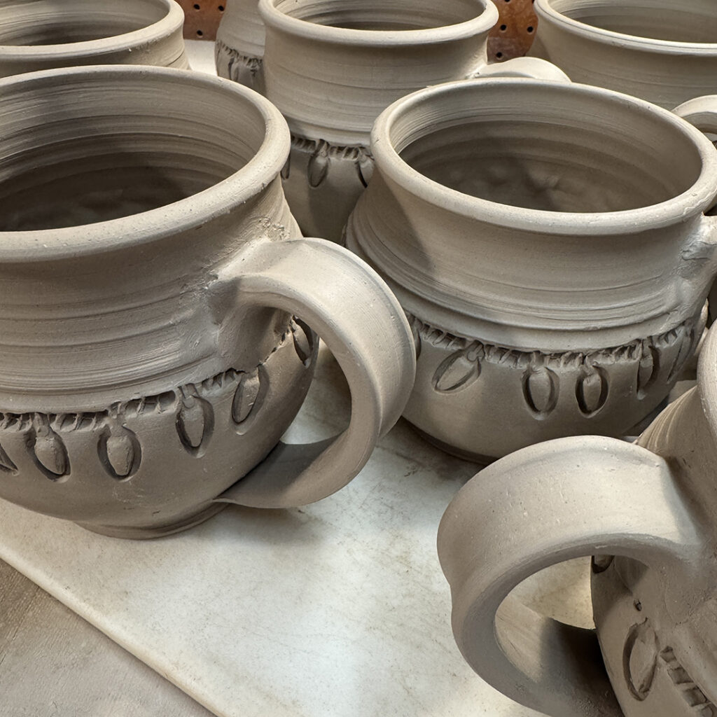 A few more shots of this year’s collection of Holiday Mugs… just in time for this weekend’s HOLIDAY HOME SHOW!!! New stamped & soda-fired mugs with a string of Holiday Lights… as well as some mugs with Christmas Trees & star toppers… kinda like last year’s holiday mugs!