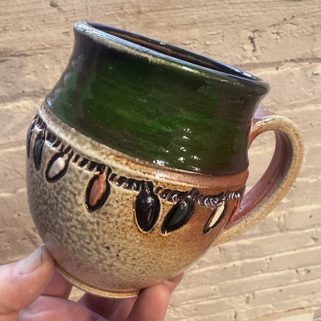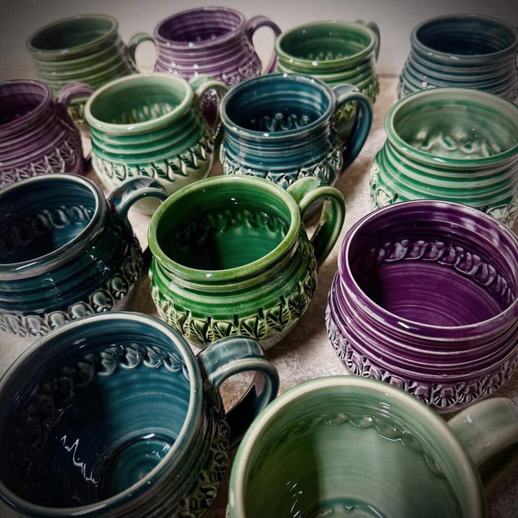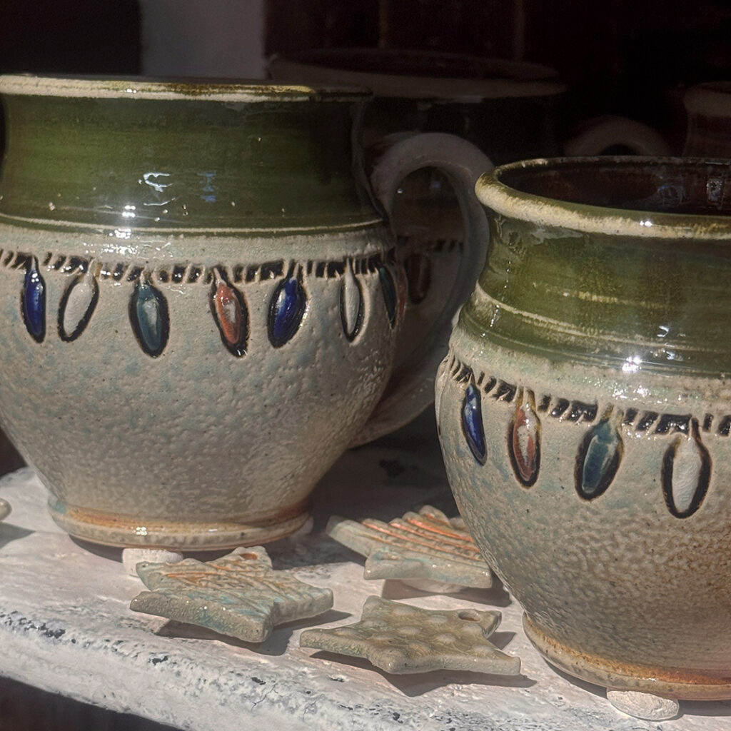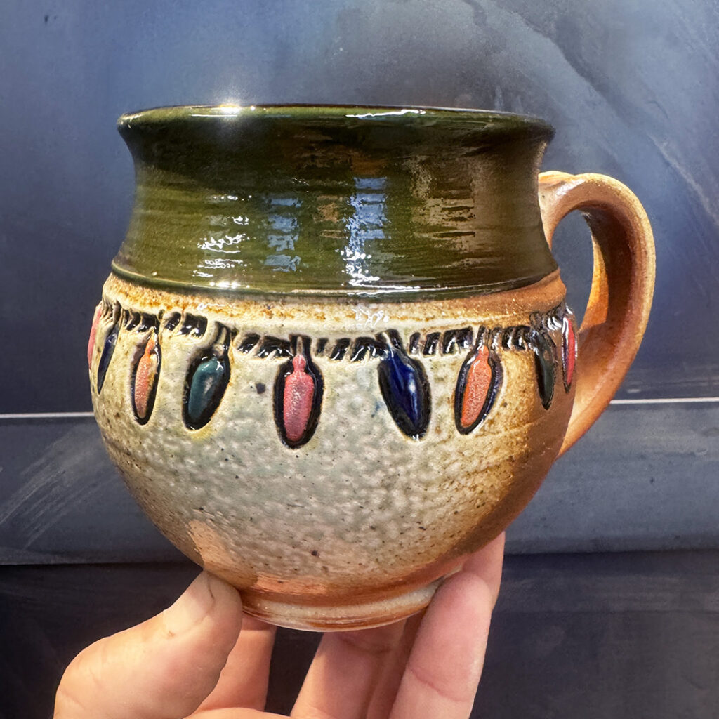 A few more shots of this year’s collection of Holiday Mugs… just in time for this weekend’s HOLIDAY HOME SHOW!!! New stamped & soda-fired mugs with a string of Holiday Lights… as well as some mugs with Christmas Trees & star toppers… kinda like last year’s holiday mugs!