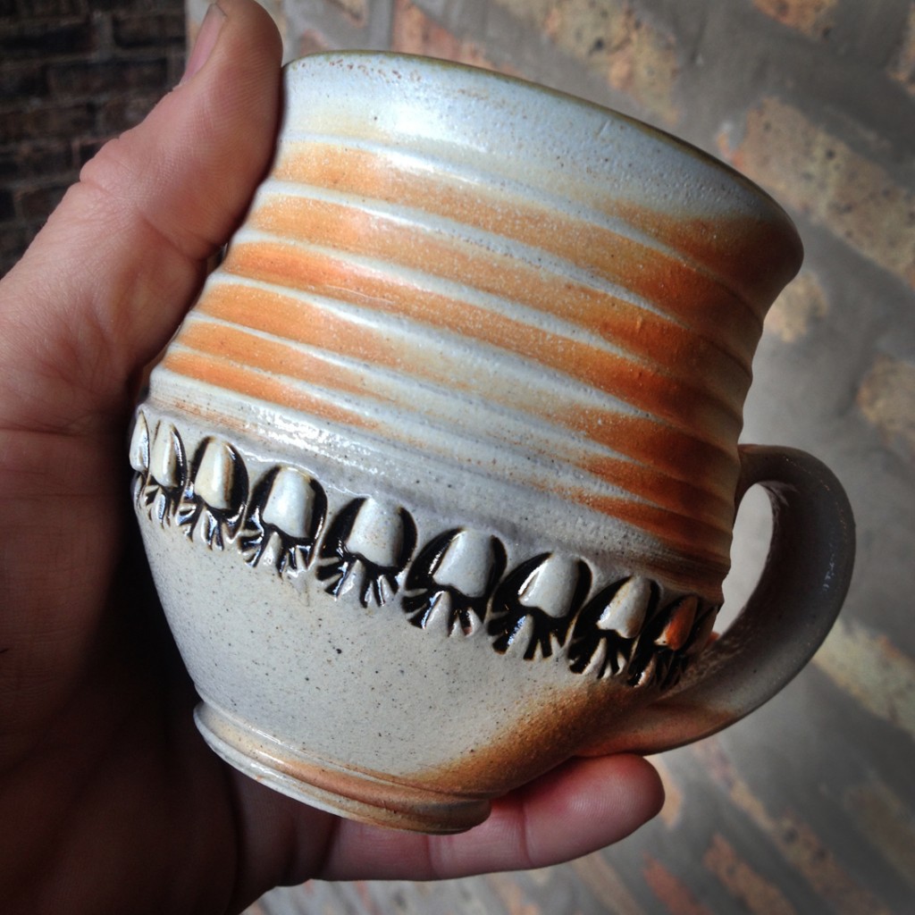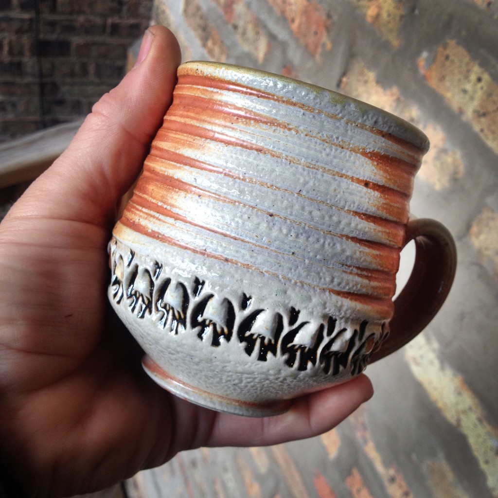 A pair of stamped & soda-fired mugs for Mugshot Monday! “Matching” is so overrated… I prefer to have “related” rather than “twins.” Lets people pick & choose a match-up for their own perfect pairs!