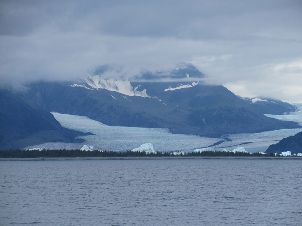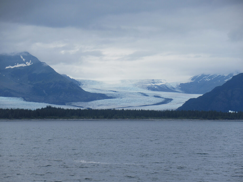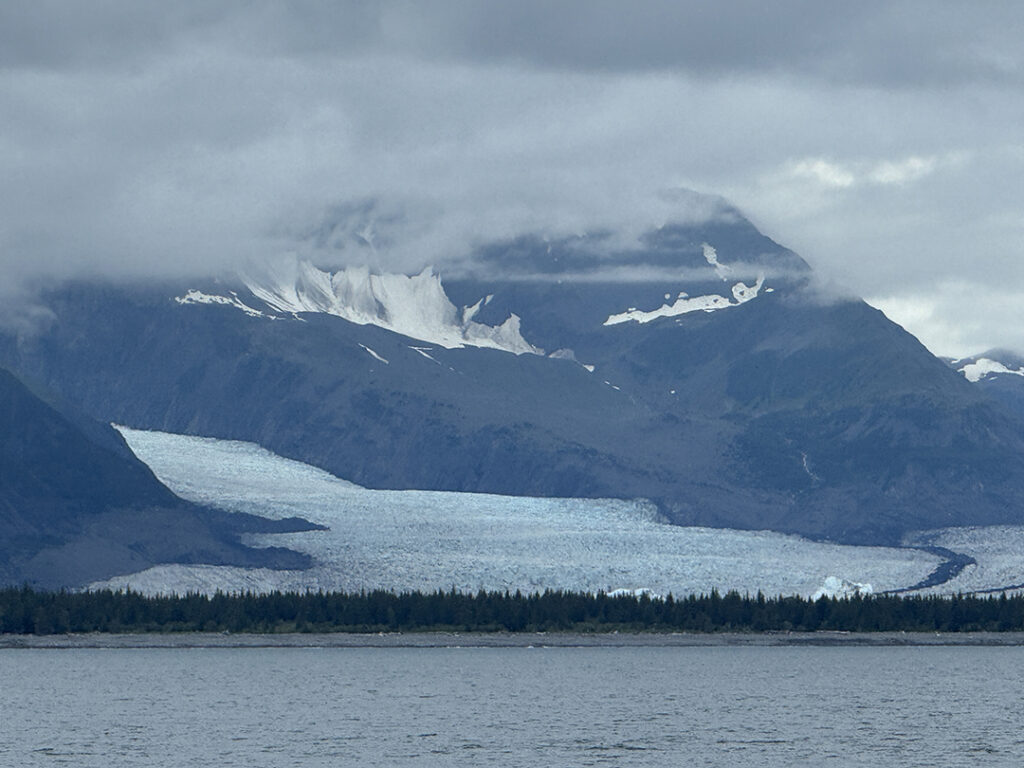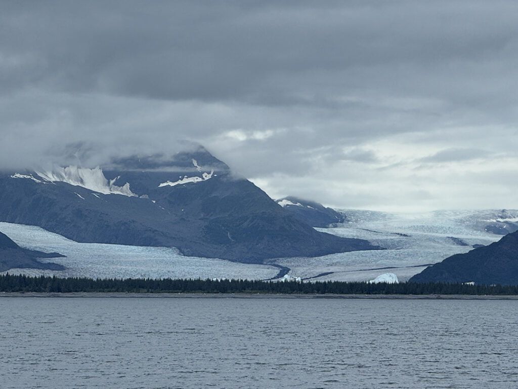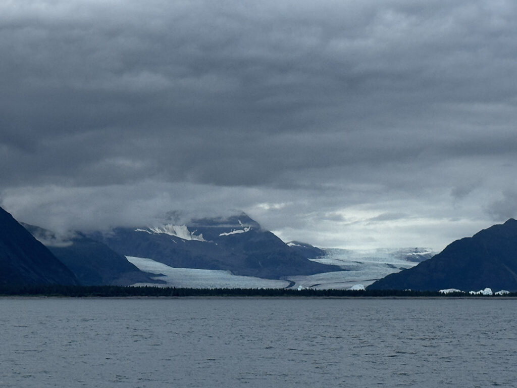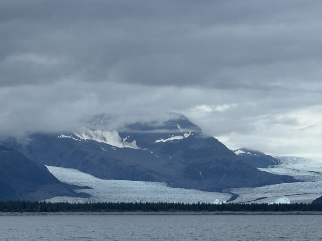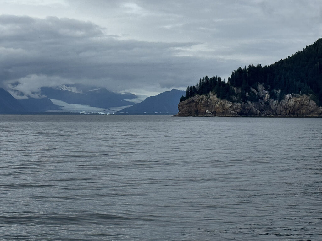 Towards the end of our Kenai Fjords boat cruise, we passed a large glacier moving all the way down to the ocean… kinda. The Captain told us that there is a line of boulders & rubble that got pushed down by the glacier over the years, creating a barrier where you now see the tree line. This barrier has grown over the years… and now there are icebergs “trapped” inside that area. So the large chunks you see just past the tree line are actually large chunks of glaciers that fell off and are now floating in the contained area. Pretty cool, huh?!