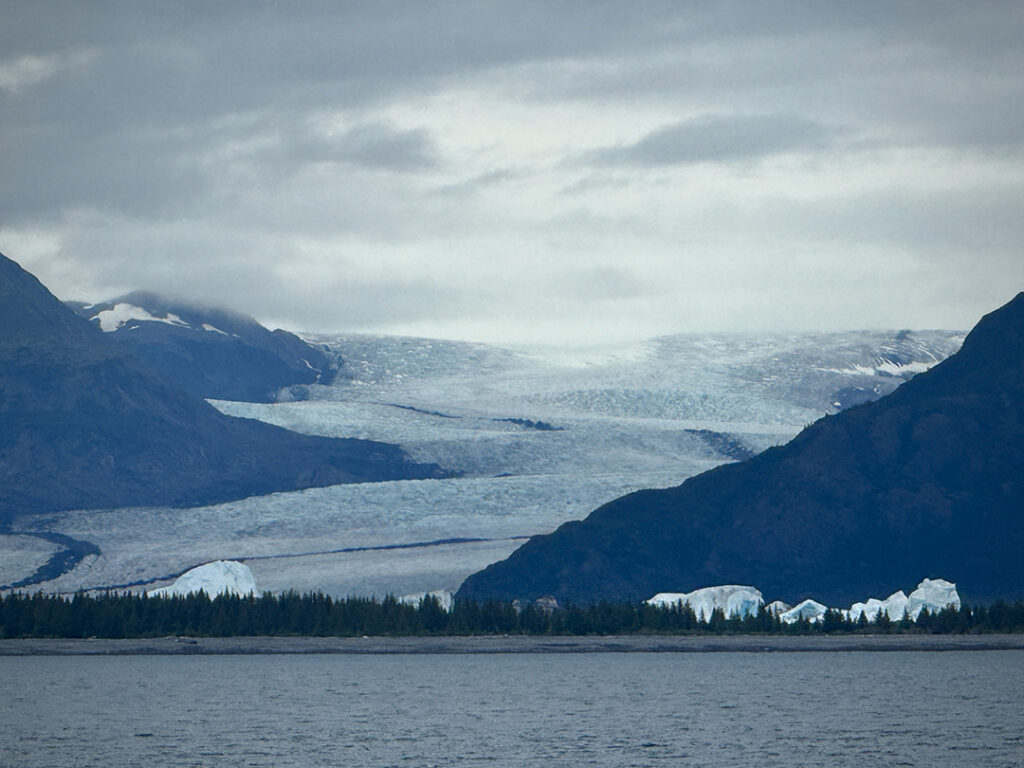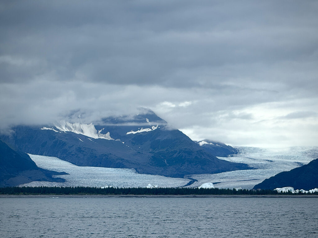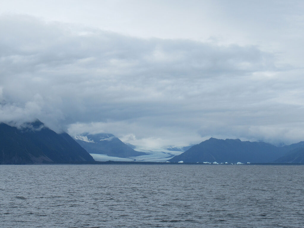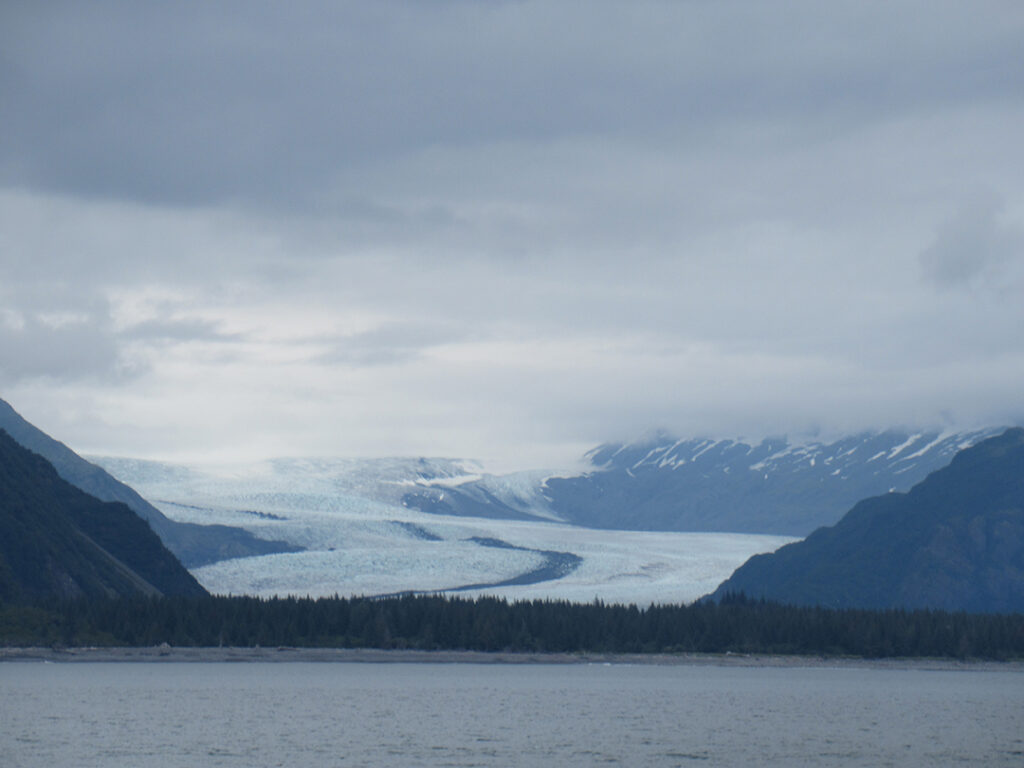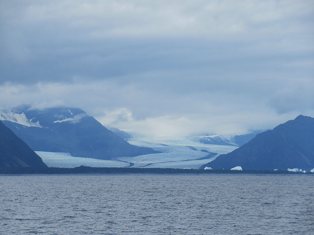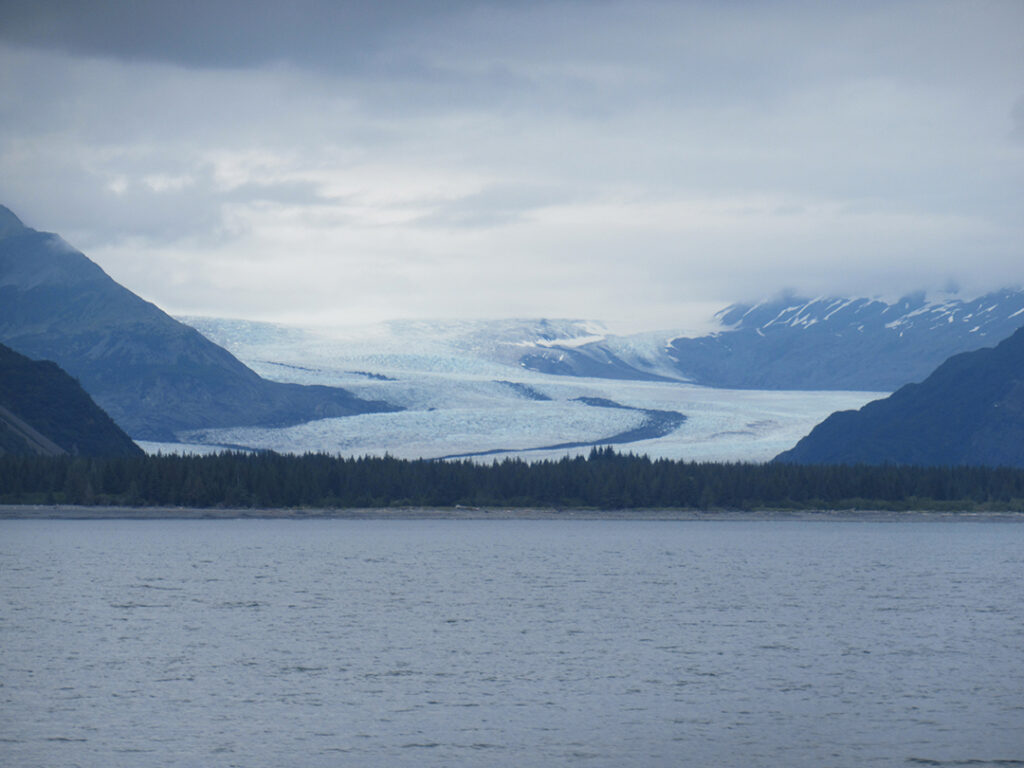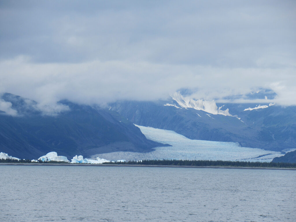 Towards the end of our Kenai Fjords boat cruise, we passed a large glacier moving all the way down to the ocean… kinda. The Captain told us that there is a line of boulders & rubble that got pushed down by the glacier over the years, creating a barrier where you now see the tree line. This barrier has grown over the years… and now there are icebergs “trapped” inside that area. So the large chunks you see just past the tree line are actually large chunks of glaciers that fell off and are now floating in the contained area. Pretty cool, huh?!