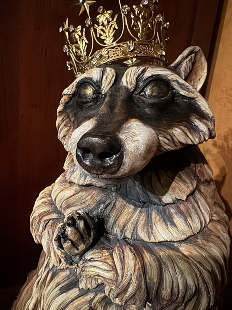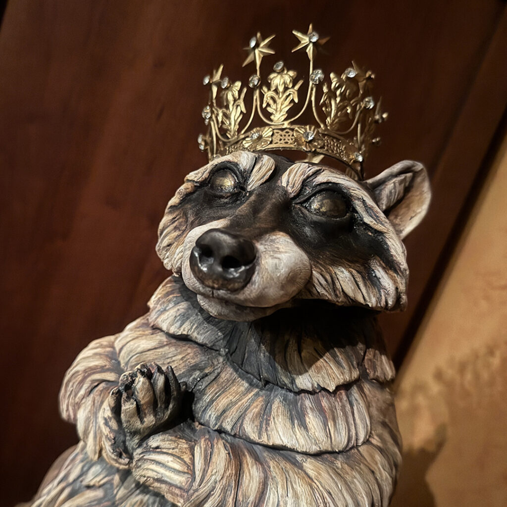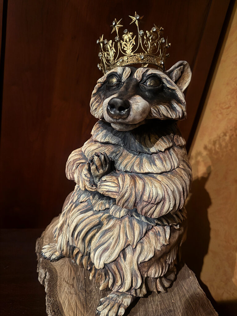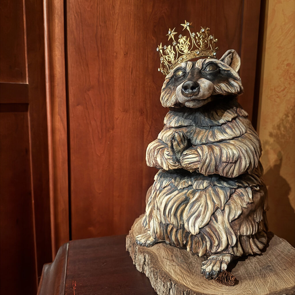Well, look who’s ready to greet everyone who comes to my place this weekend for my HOLIDAY HOME SHOW. It’s the “King Of The Raccoons” from the “The Animal King-dom Exhibition.” Amazing animal sculptures by my friend Deana Bada Maloney… each with a sense of whimsy… and you know hoe I LOVE whimsy!!! This little cutie came home with me from ART IN THE BARN this summer… and is anxiously waiting for his big debut next weekend!