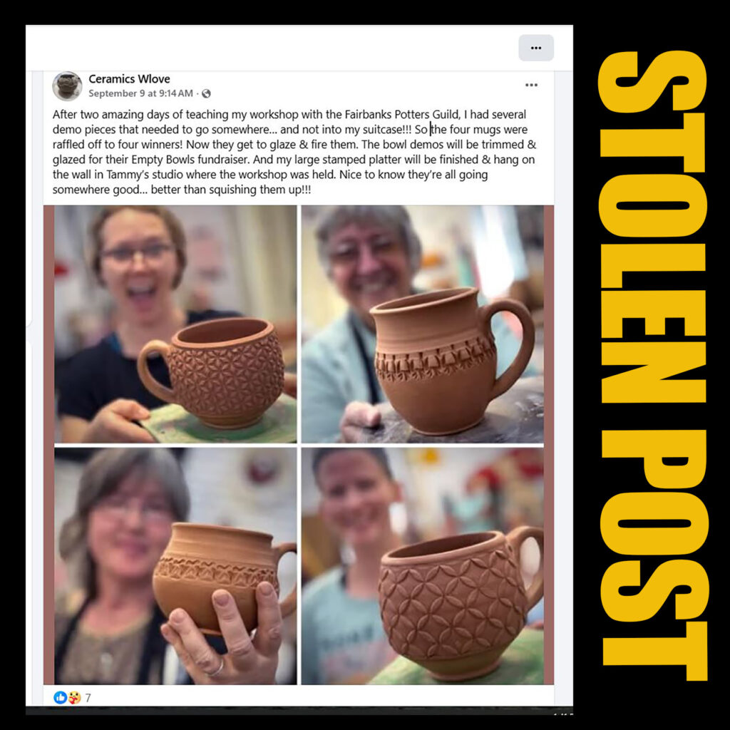 It was a weird feeling having my own hybrid mug images stolen off my social media… unethically used to promote another pottery business. It may have happened before, but this was the first time I was made aware of it… and it was SO obvious!!!! They didn’t even think to remove the Chicago flag flowerpot that lives in my studio from one of the pictures!!!