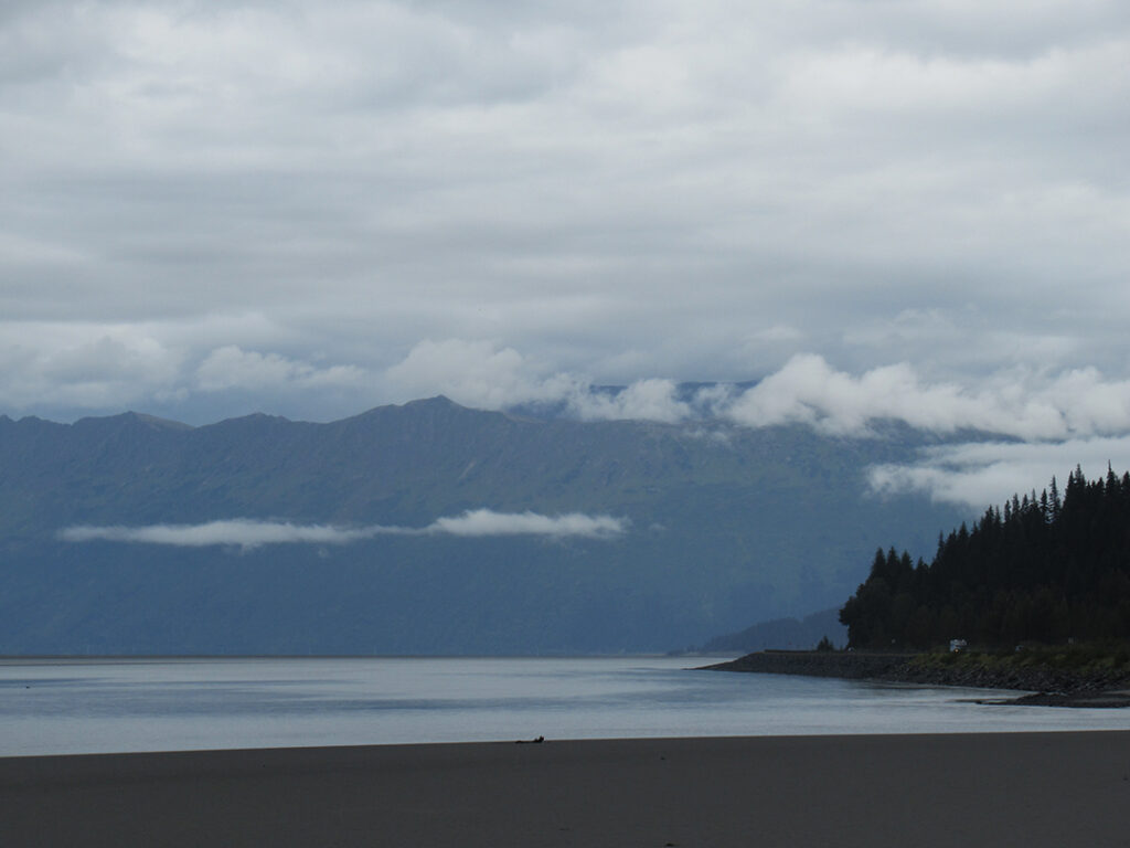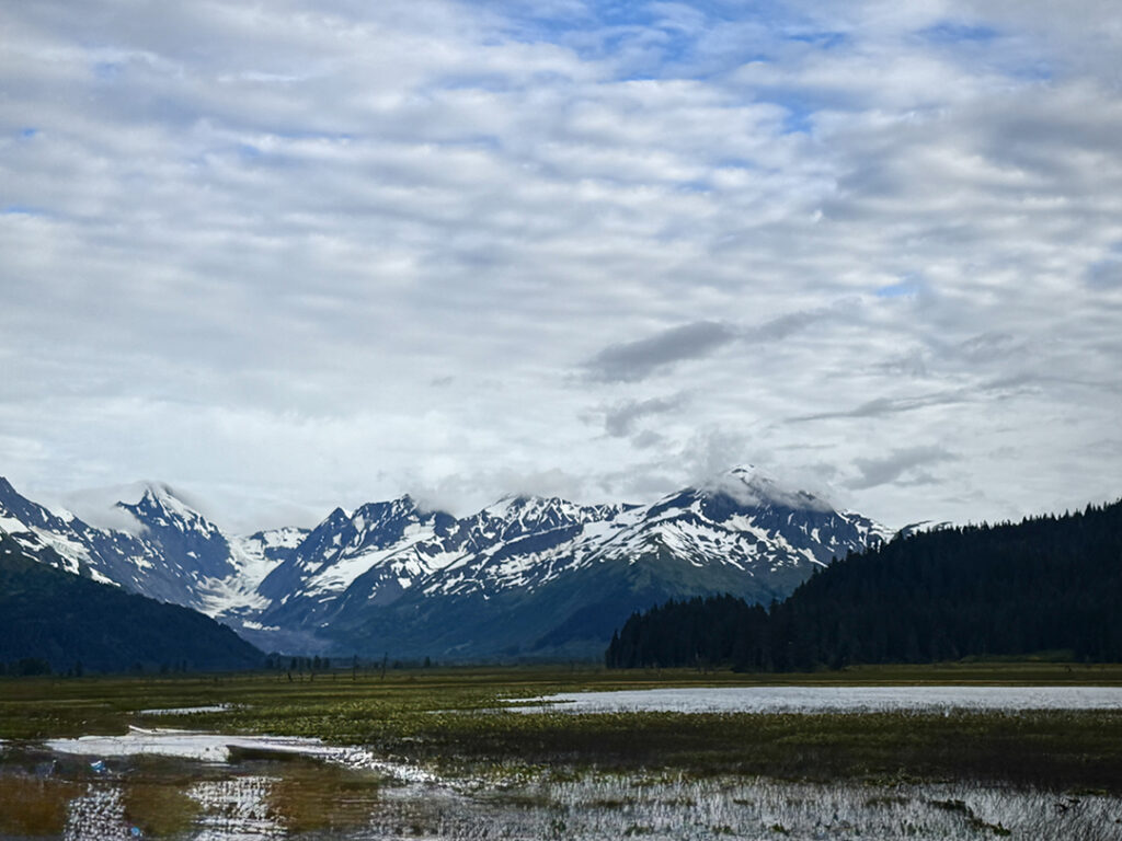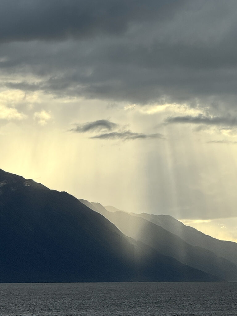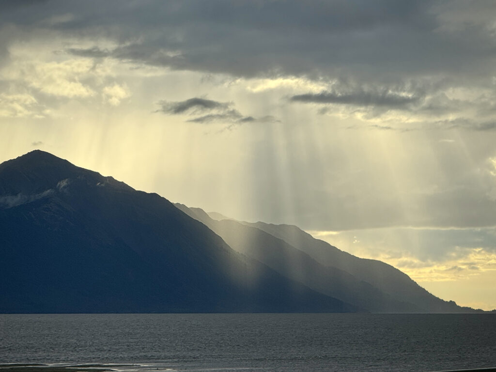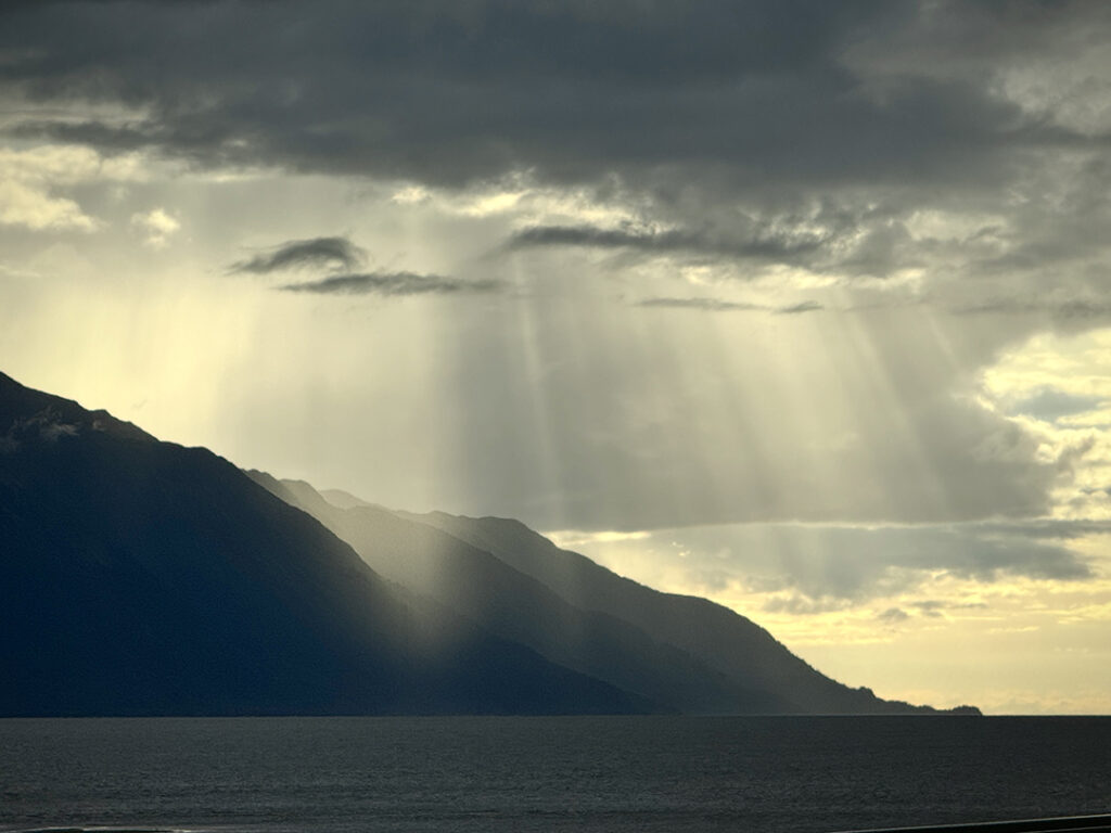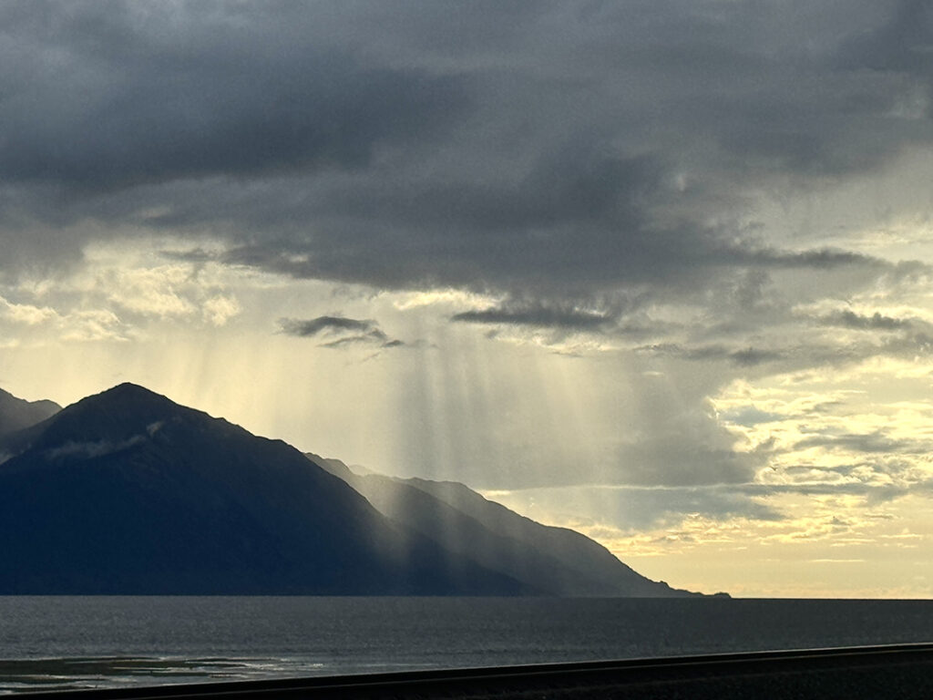 Heading out of Seward after the ocean boat tour toward Anchorage… we were back on the road ready for more snow-capped mountains, swampy lagoons, waterfalls & big sky clouds. What I wasn’t expecting?… a pretty FANTASTIC sunset with sunbeams streaking across the sky!