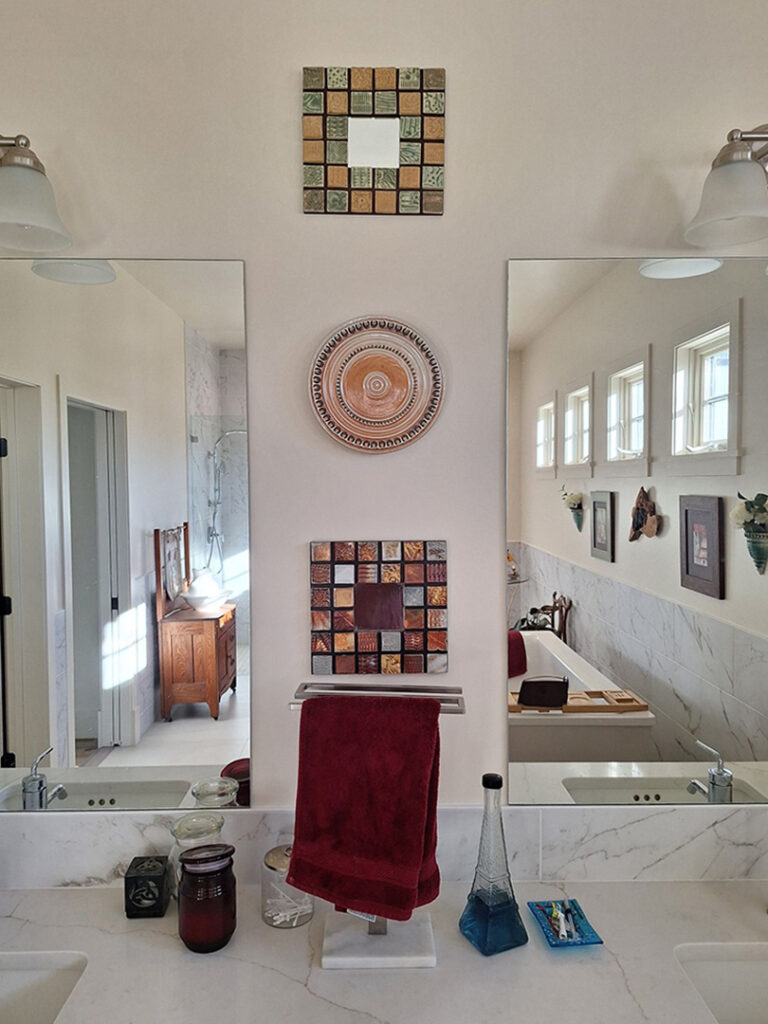 So apparently this is “a thing” now??? After last night’s post about the bathroom remodel based on one of my wall pocket vases… this morning I got another one!!! Longtime friend & follower Jean sent me photos of HER bathroom… also centered around a few of my tiled pieces, a round disc & a couple all pocket vases! Pretty cool huh?! Any other interior designers needing some inspiration?… c’mon over!!!