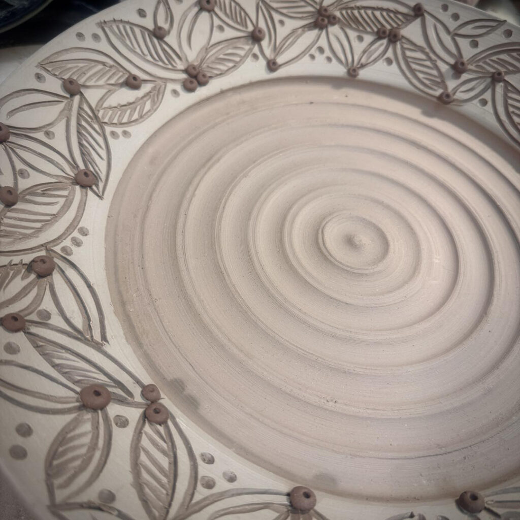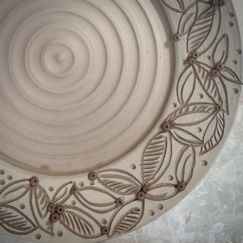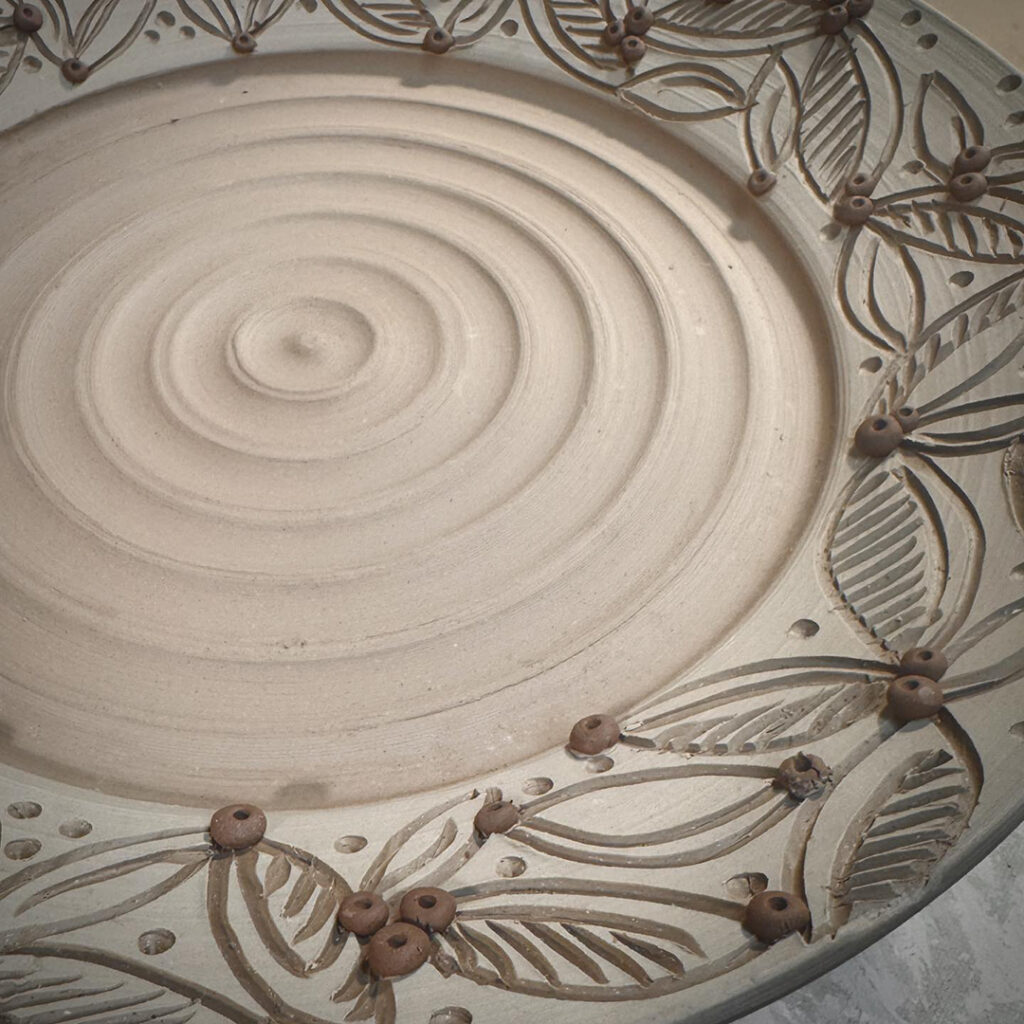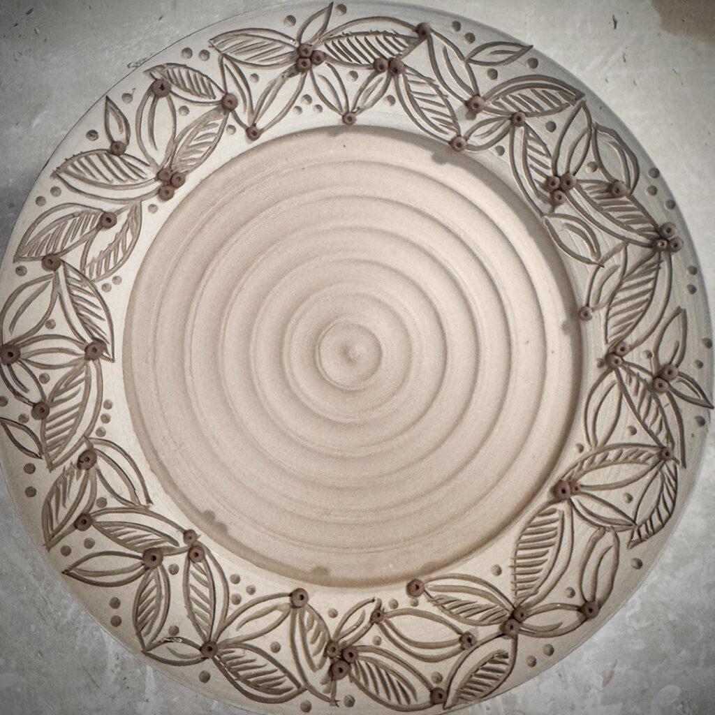 What started out as a class demo on decorative carving… while sharing some of my favorite DiamondCore Tools… turned into this large decorative platter!!! With a thick band of white slip, carvings through the slip to reveal the clay body contrast… and little “berries” of clay on top. Sometimes deciding when to stop is the hardest part!!!