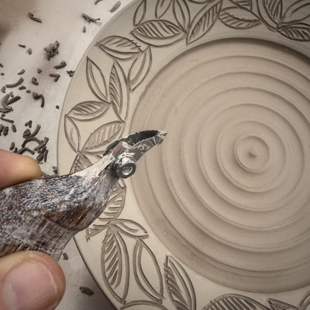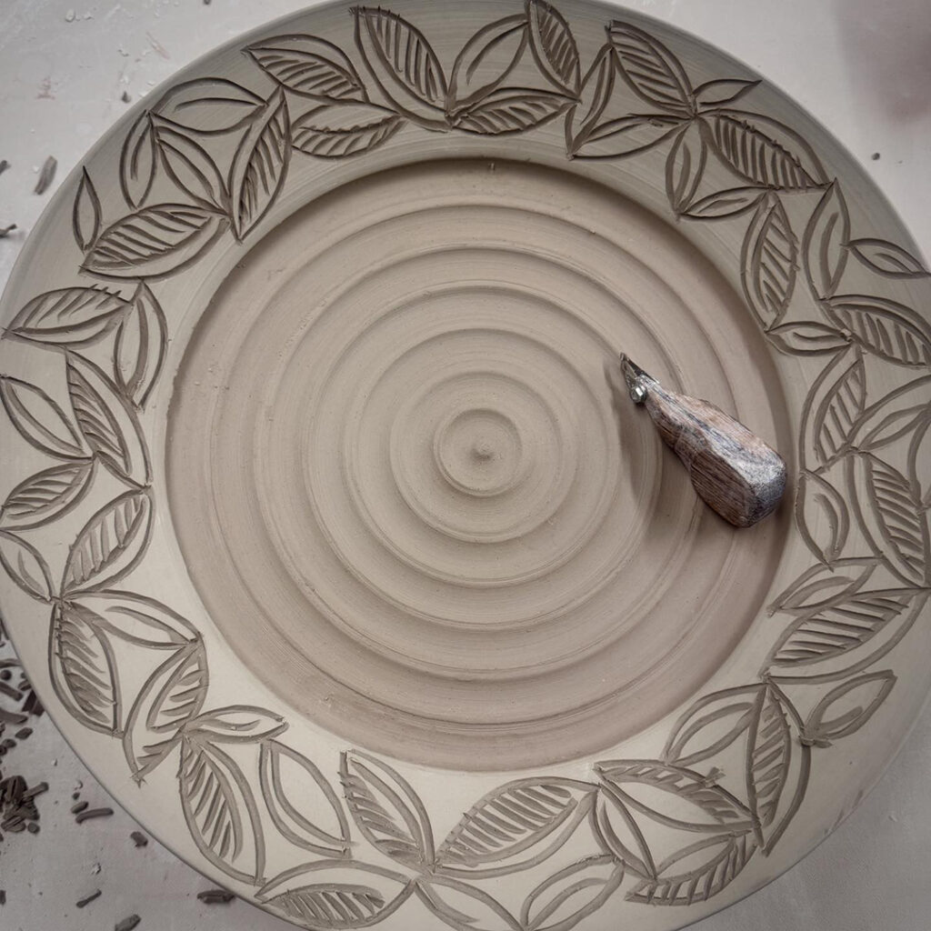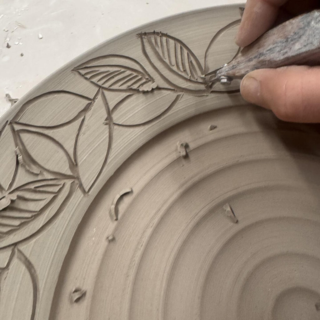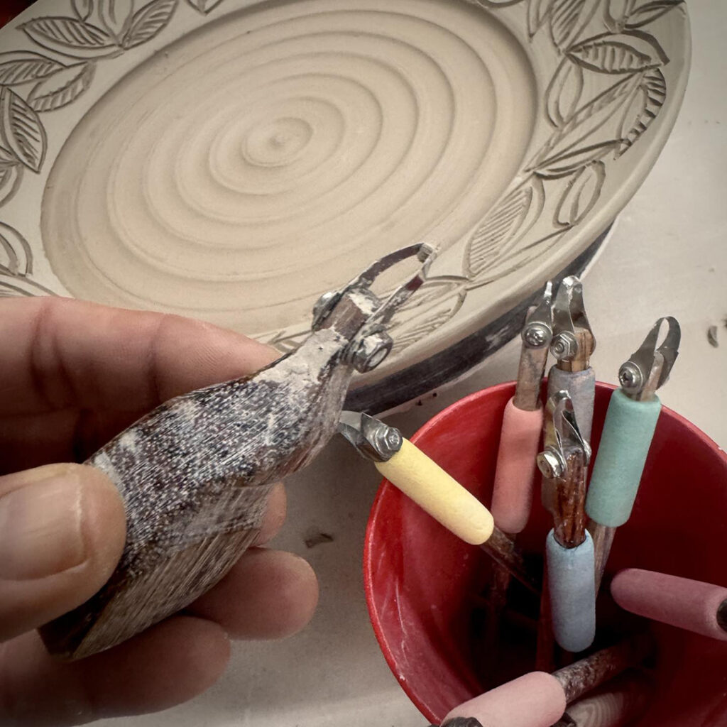 What started out as a class demo on decorative carving… while sharing some of my favorite DiamondCore Tools… turned into this large decorative platter!!! With a thick band of white slip, carvings through the slip to reveal the clay body contrast… and little “berries” of clay on top. Sometimes deciding when to stop is the hardest part!!!