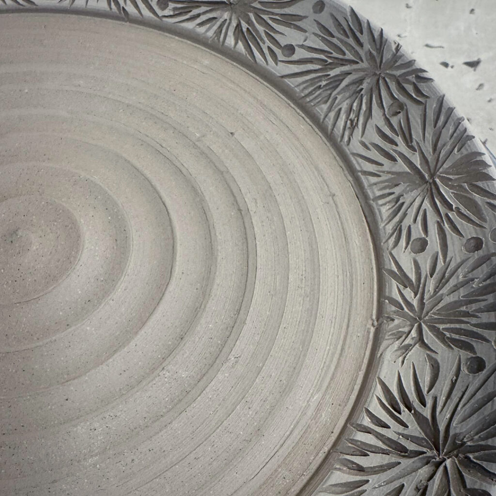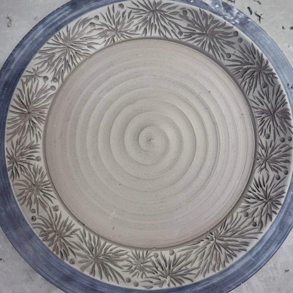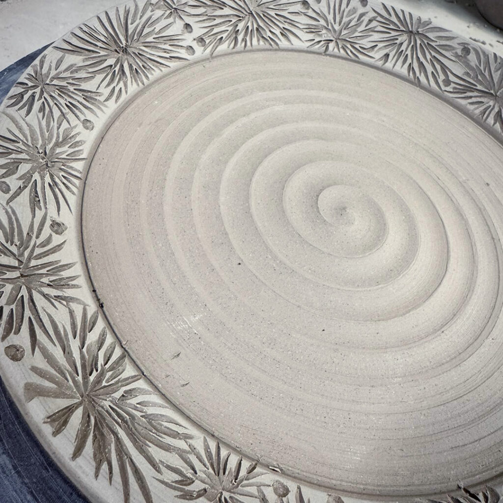 Just a little early morning carving. A quick dinner plate with leatherhard white slip on the rim… before carving with my favorite carving tool from DiamondCore Tools.