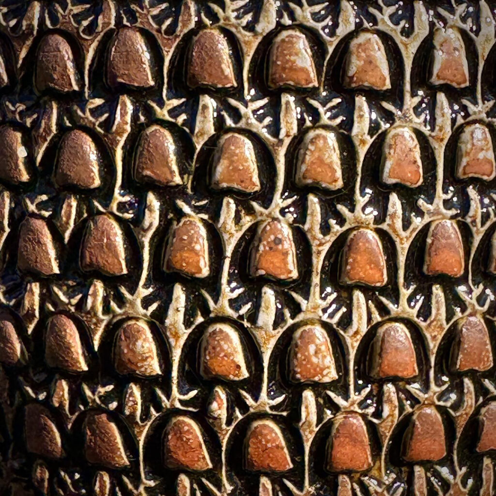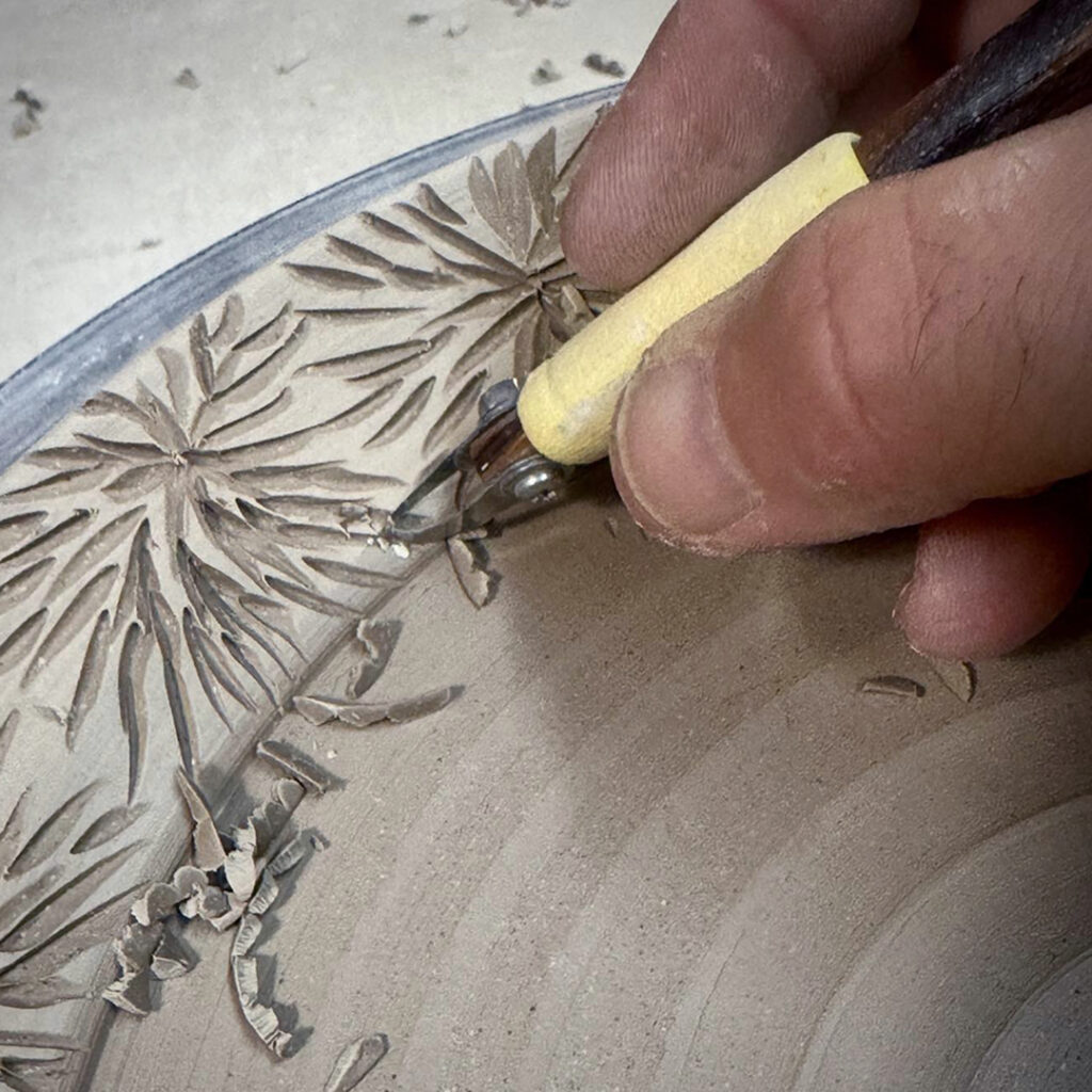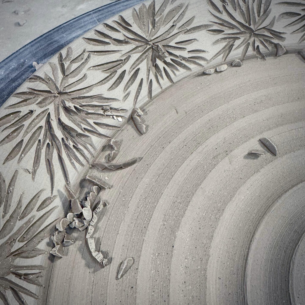 Just a little early morning carving. A quick dinner plate with leatherhard white slip on the rim… before carving with my favorite carving tool from DiamondCore Tools.