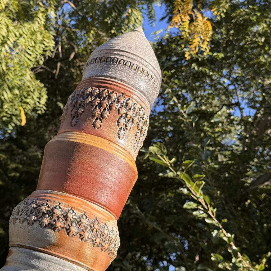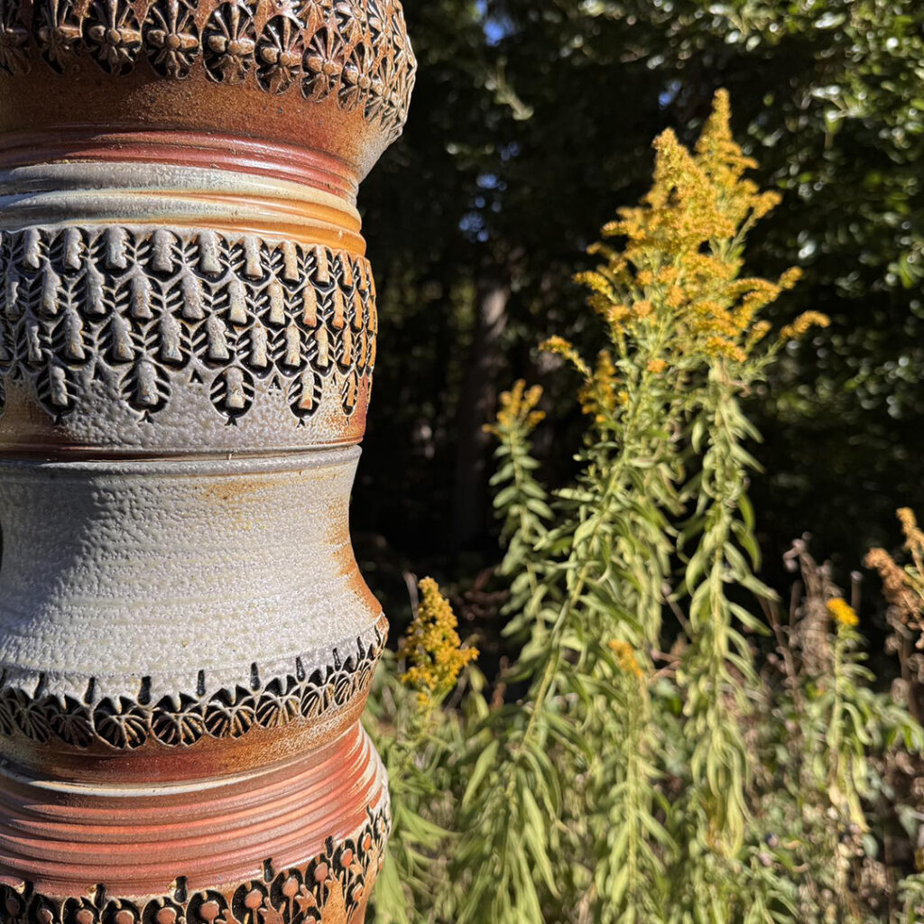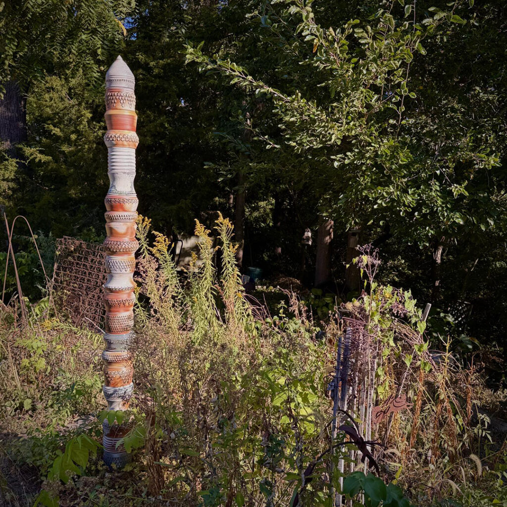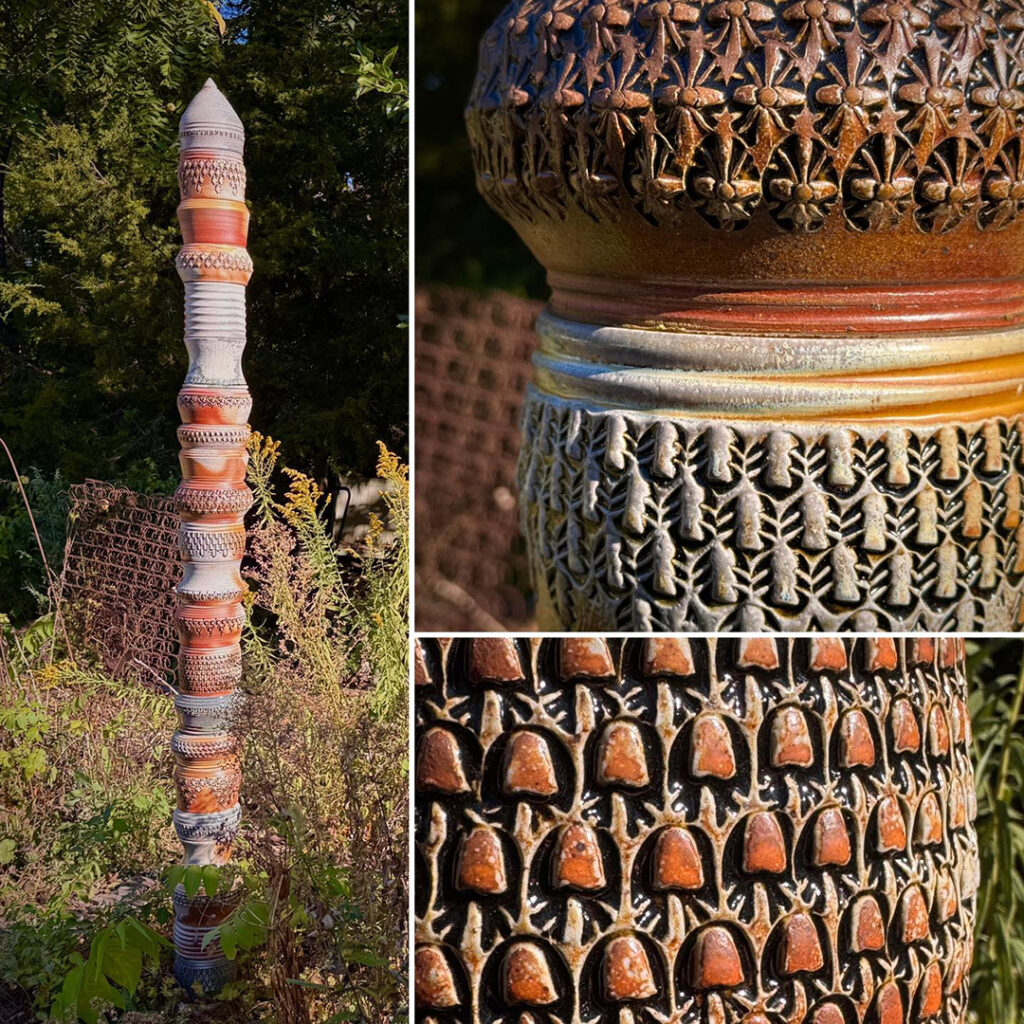 We had a beautiful Fall weekend a couple days ago. Perfect for a roadtrip weekend down to Peoria to visit with friends. Oh yeah… and to re-visit the stamped & soda-fired totem pole in their front yard!! Look familiar???