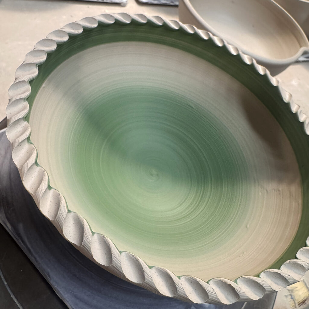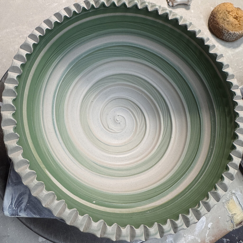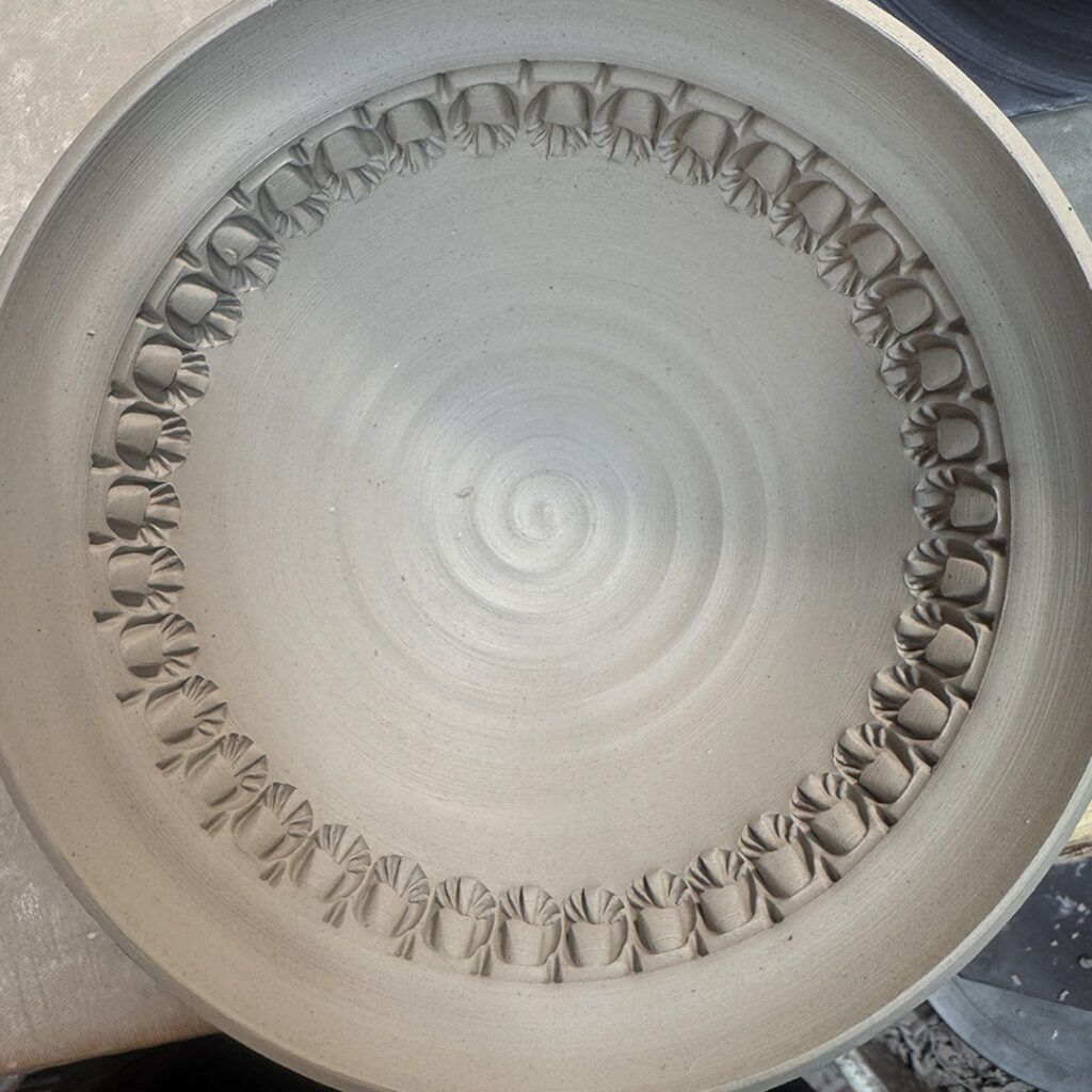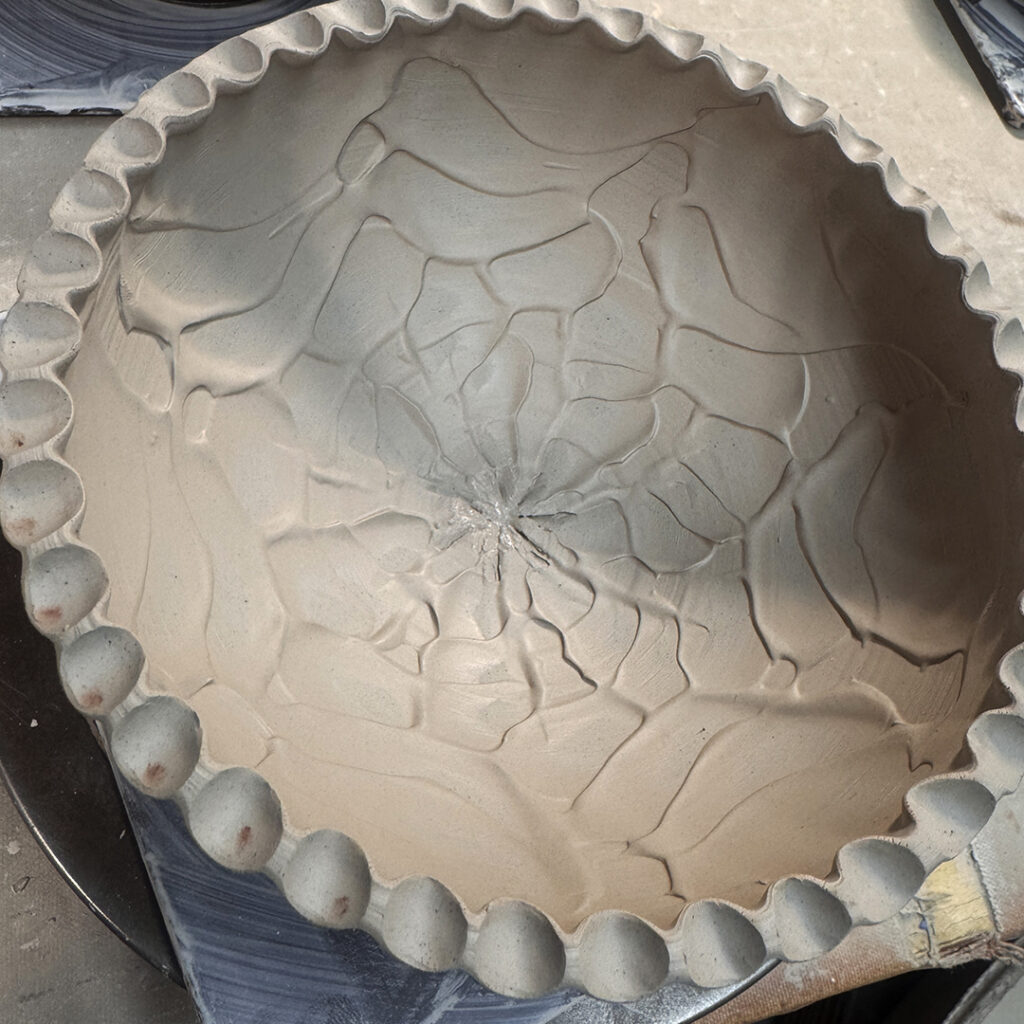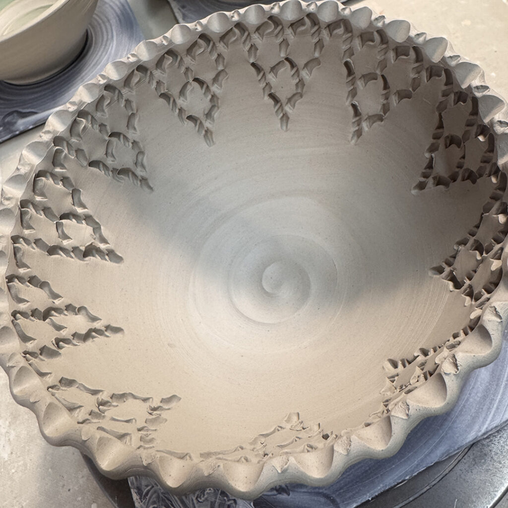 Last night in class, we broke out the new 10” decorating disk from MKM POTTERY TOOLS. Darcy was trying to draw a mandala pattern & wanted to space things out perfectly. The decorating disk made it so easy… and the new 10” size was perfect for decorating her pie plate!