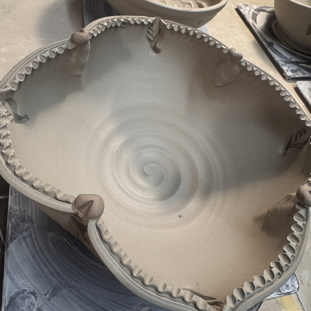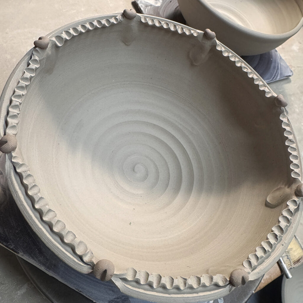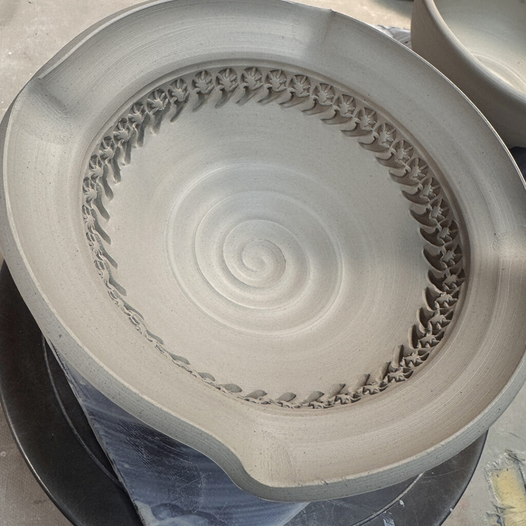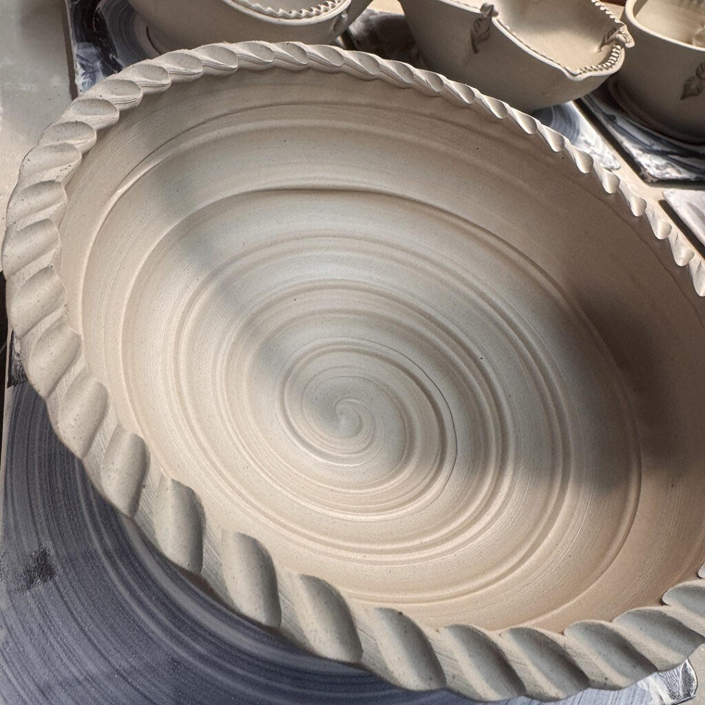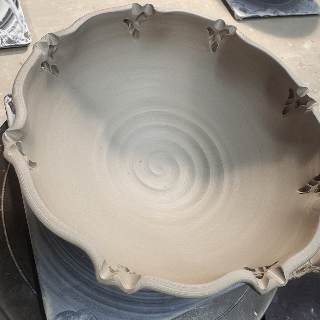 Last night in class, we broke out the new 10” decorating disk from MKM POTTERY TOOLS. Darcy was trying to draw a mandala pattern & wanted to space things out perfectly. The decorating disk made it so easy… and the new 10” size was perfect for decorating her pie plate!