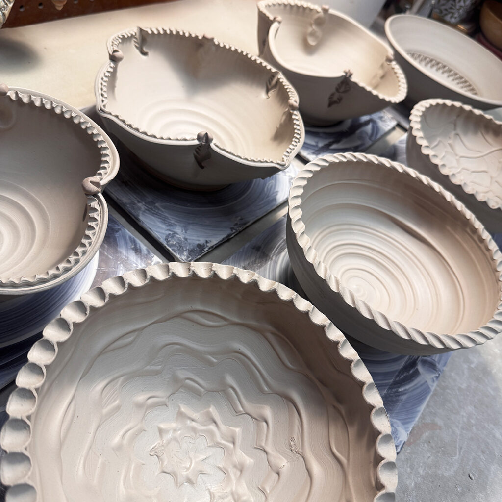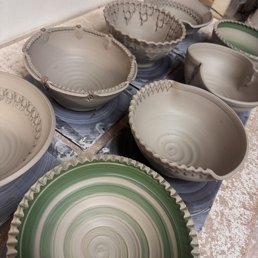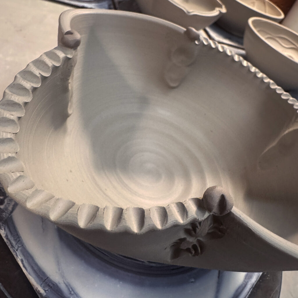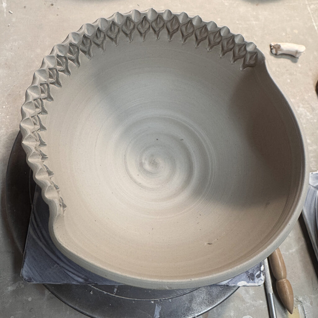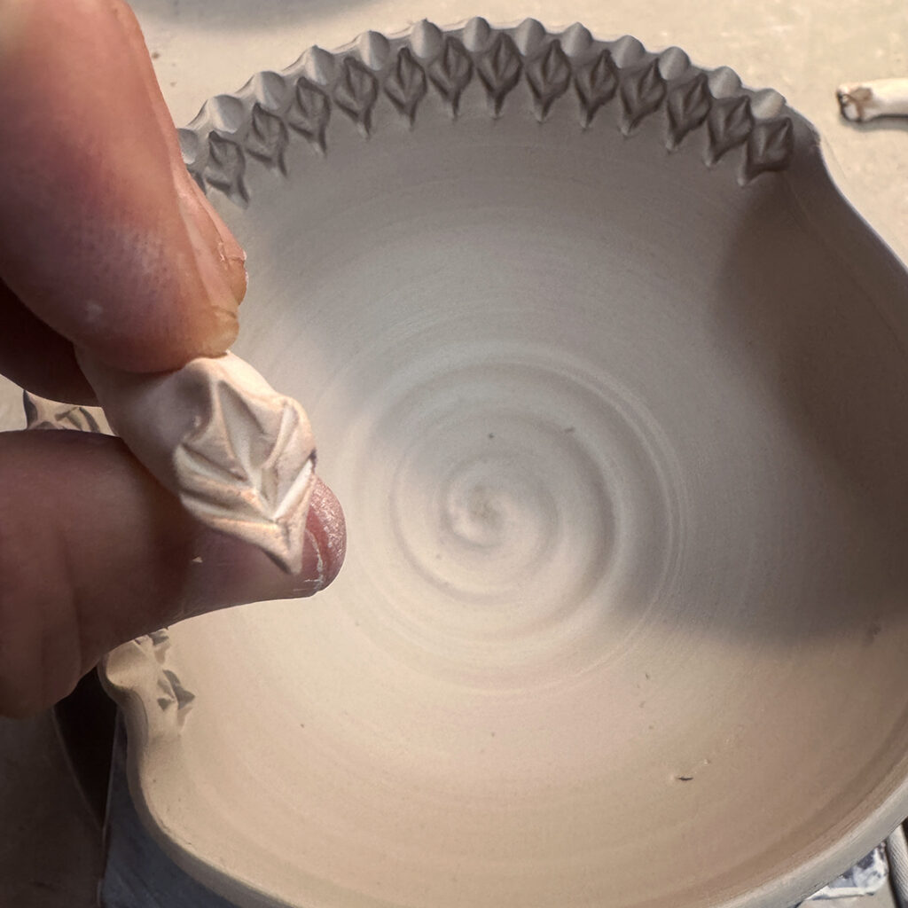 So the bowls that I made with my class this week have been “living under plastic” in my studio… and I finally got around to doing a little sumthin’-sumthin’ with them. Sure, I coulda left them as they were with their simple altered rims… but you know I’m a MORE IS MORE kinda guy! So I added a little more…
